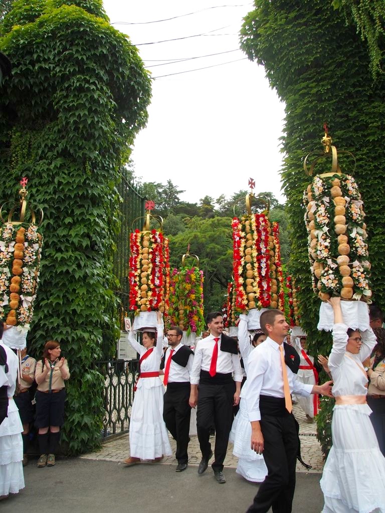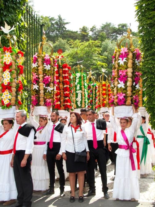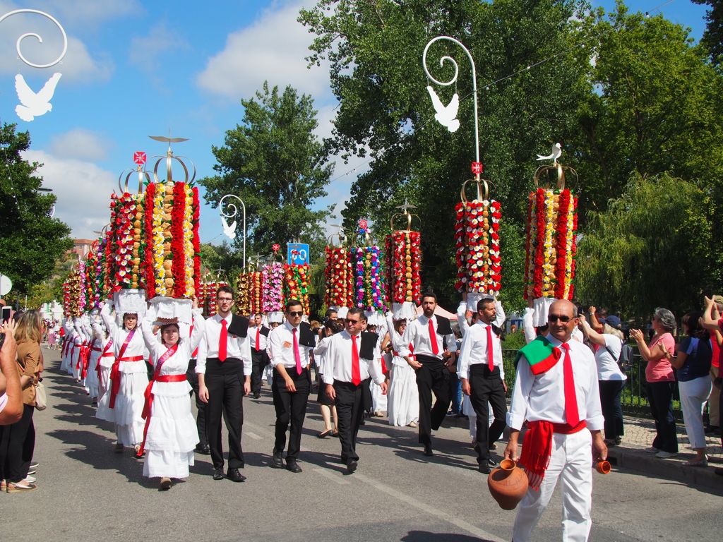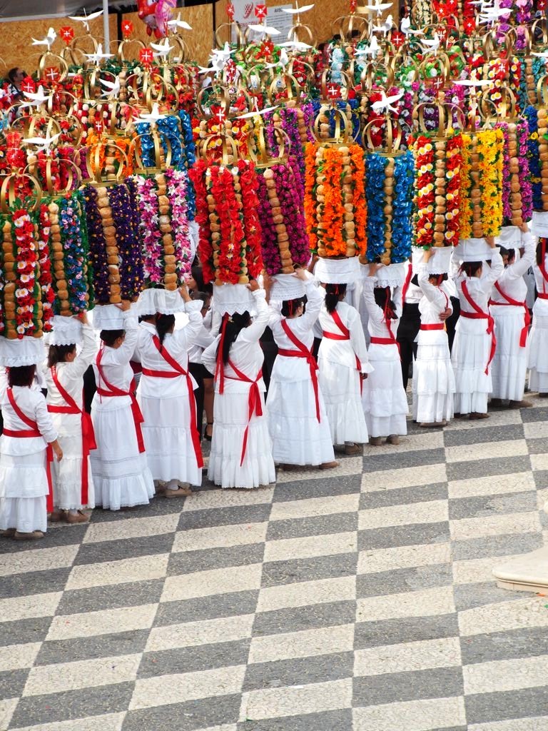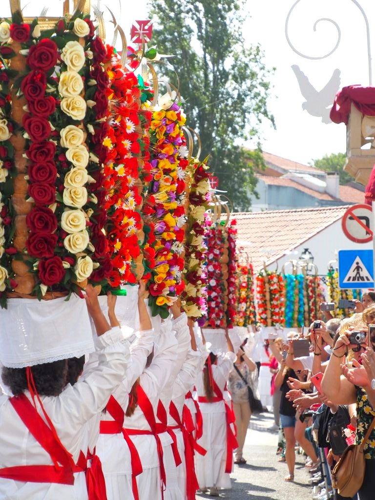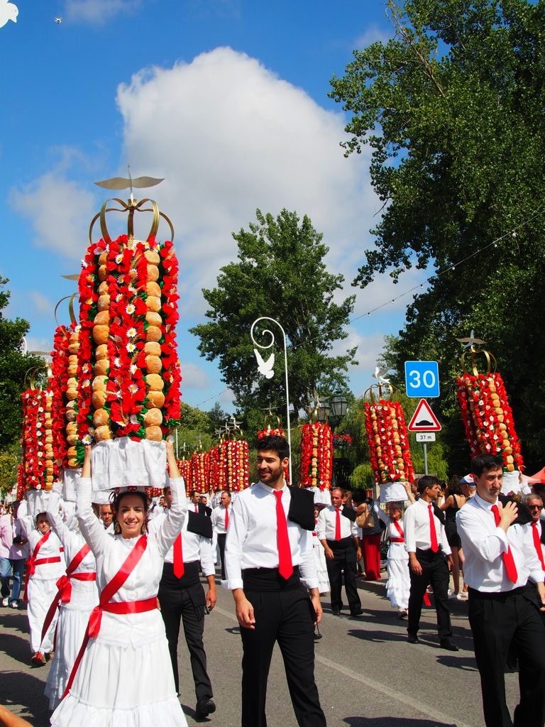 Le dimanche après-midi, c’est enfin le moment tant attendu, le cortège principal : les femmes portant les Tabuleiros, accompagnées chacune d’un homme, quittent le parc et se regroupent sur la place principale. Nous nous sommes joint à l’un des groupes que nous avons accompagné depuis le parc jusqu’à la place de la République. Ce fut une expérience unique et vraiment impressionnante avec tout ce monde tout autour ! Au fur et à mesure, les hommes, qui sont là pour aider les femmes en cas de besoin, commencent à avoir du boulot vu le poids des tabuleiros. Les hommes les prennent sur leurs épaules quand les femmes n’en peuvent plus.