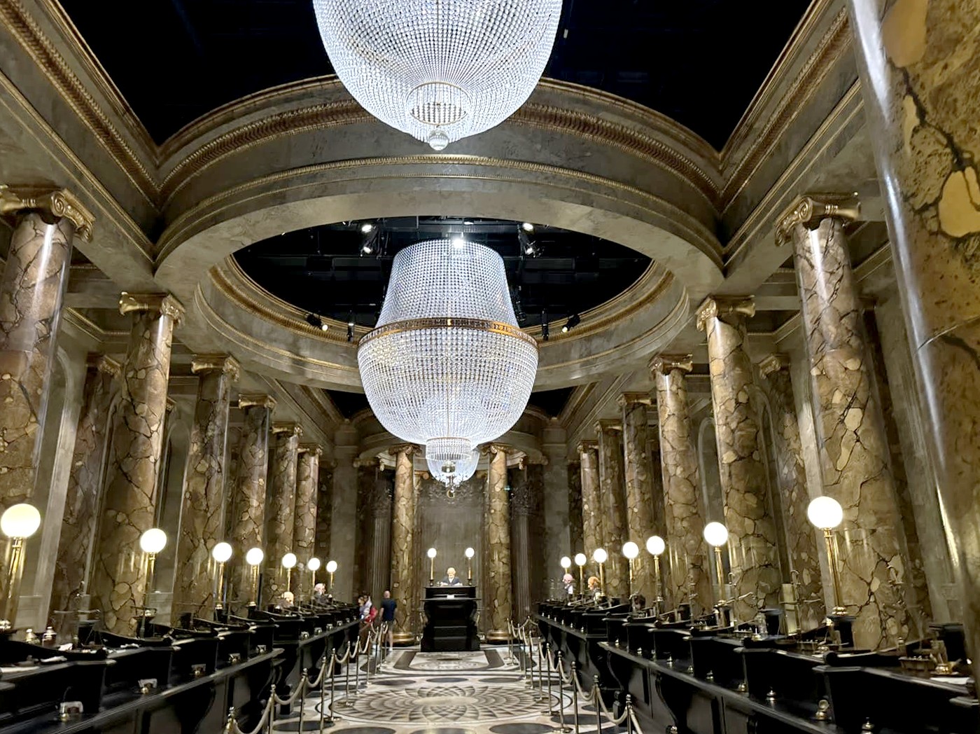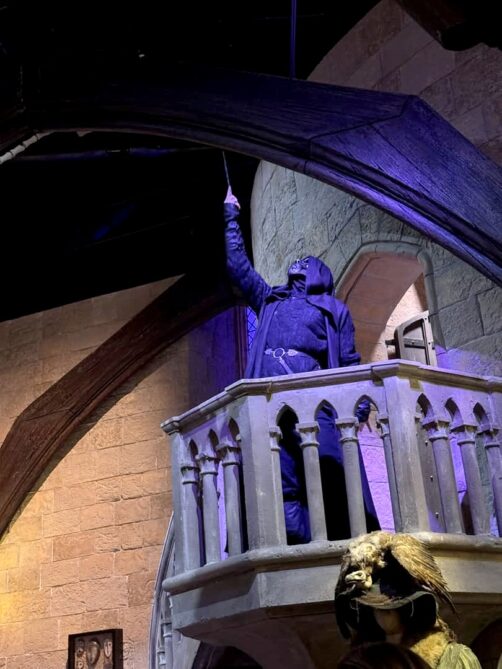 A la fin de la salle, on trouve aussi les décors du Ministère de la Magie, qui donnent sur les portes de Poudlard, menant…