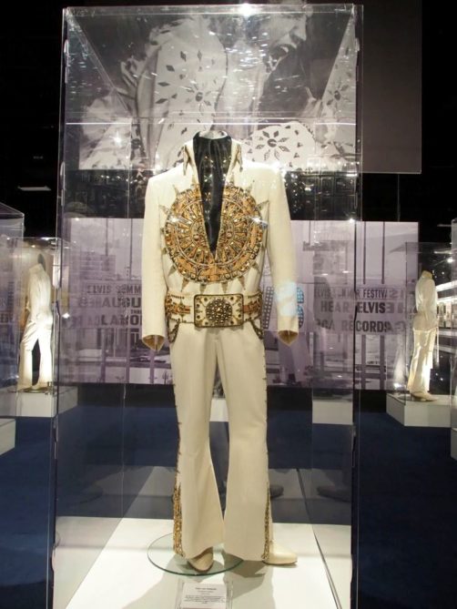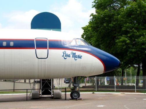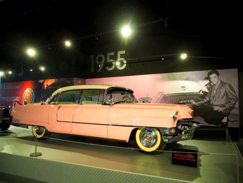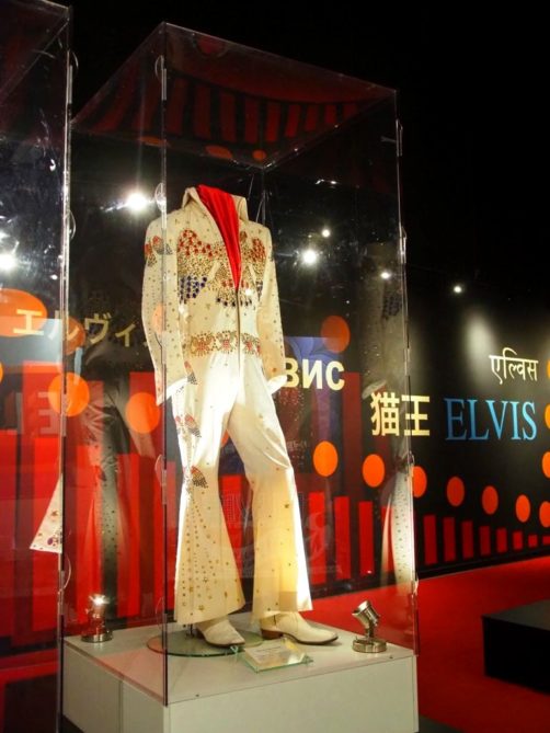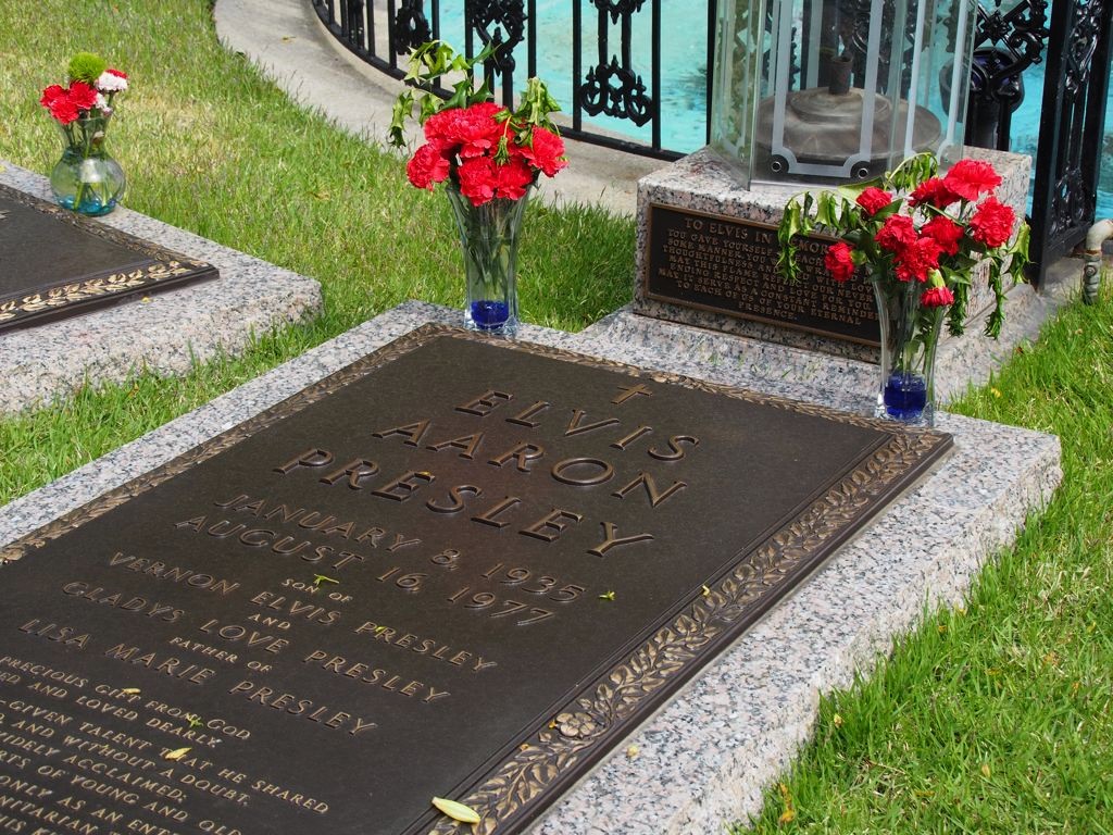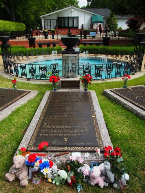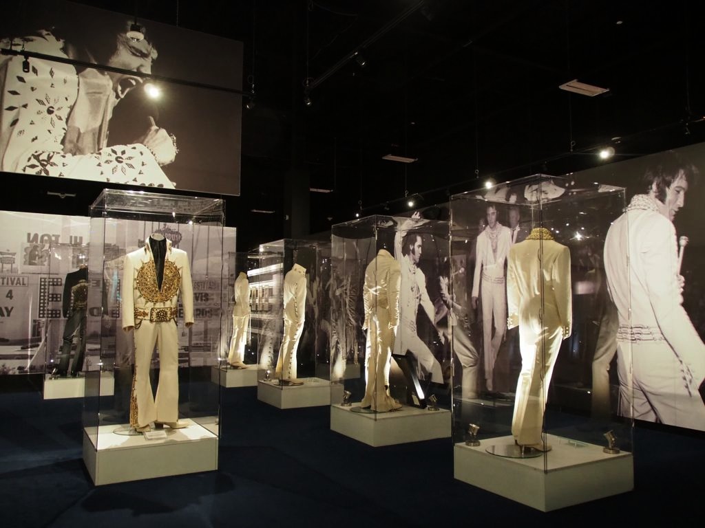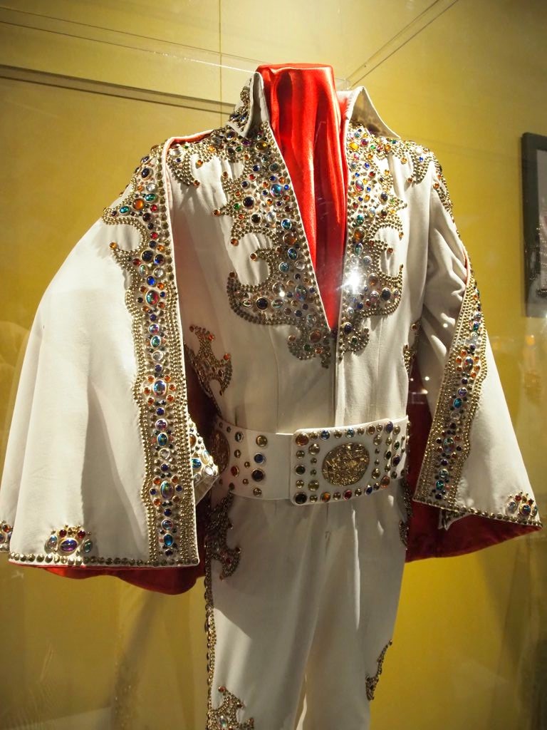 On termine la visite de la maison en se recueillant sur la tombe d’Elvis… Mais la visite de Graceland ne s’arrête pas là ! Pour un « petit » supplément, on peut aussi visiter une série d’expositions dont la collection de voitures (avec notamment sa fameuse Cadillac rose) et les avions d’Elvis (dont le plus grand a ses finitions… en or). Il y a aussi d’autres expositions thématiques, comme Elvis à l’armée, Elvis au cinéma,… On y retrouve aussi bien sur une profusion de costumes, ainsi que son mur de disques d’or et de platine.