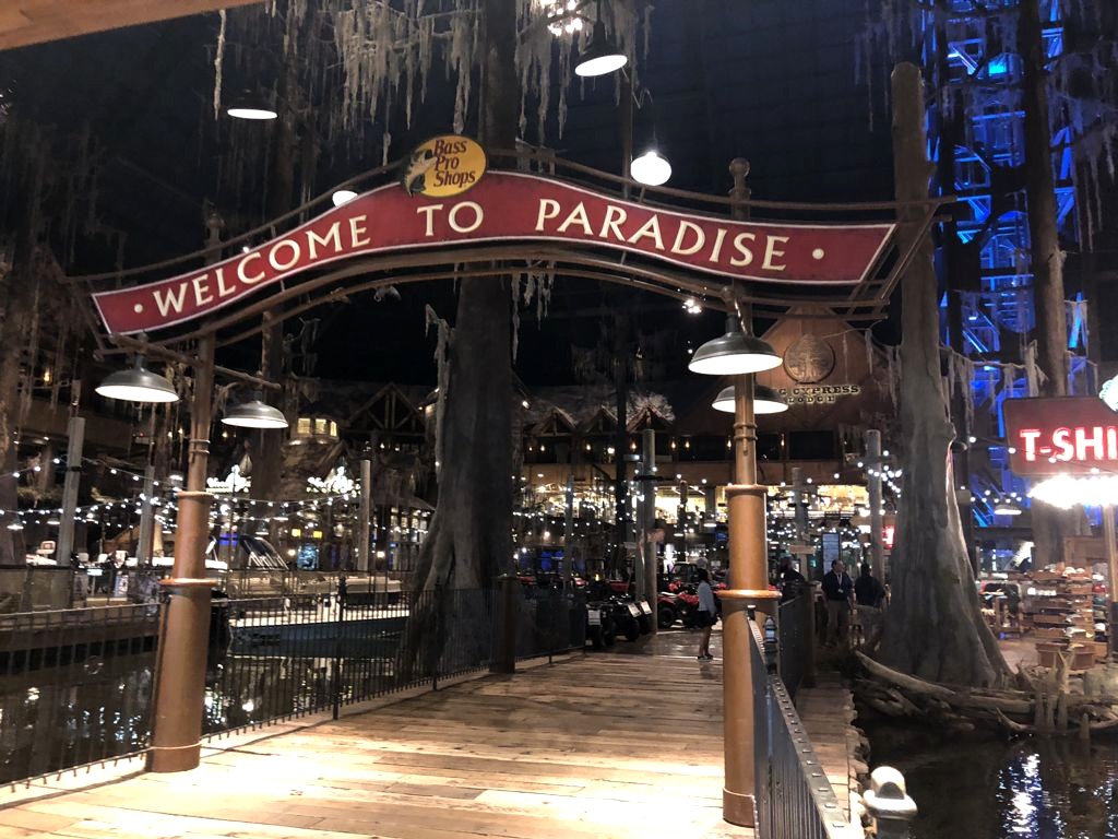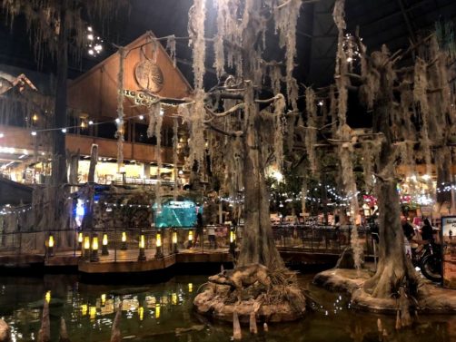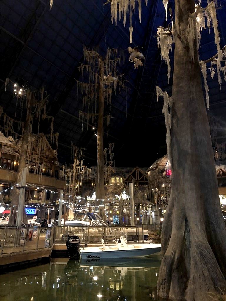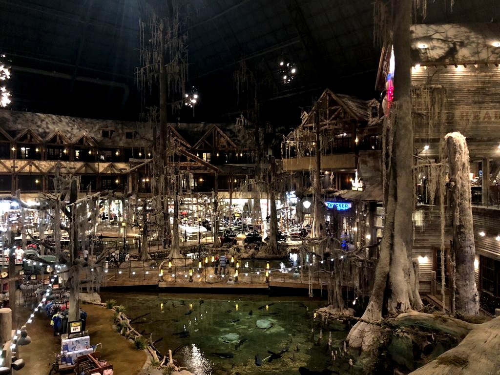 Notre première visite insolite à Memphis fut au Bass Pro Shops at The Pyramid. Un GIGANTESQUE magasin de… chasse et pêche situé dans une grande pyramide en verre (un clin d’œil à Memphis, Egypte). On était trop intrigué que pour ne pas aller y faire un tour et franchement… c’était encore pire que ce que j’imaginais ! On dirait presque un parc d’attractions, c’est l’exemple typique de la démesure à l’américaine… avec stands de tir, animaux empaillés, aquarium, faux cyprès énormes et un énorme ascenseur en verre au milieu de tout ça pour monter jusqu’à une vue panoramique sur Memphis (ça, par contre, c’est payant). Oh, et il y a même un hôtel aussi à l’intérieur !