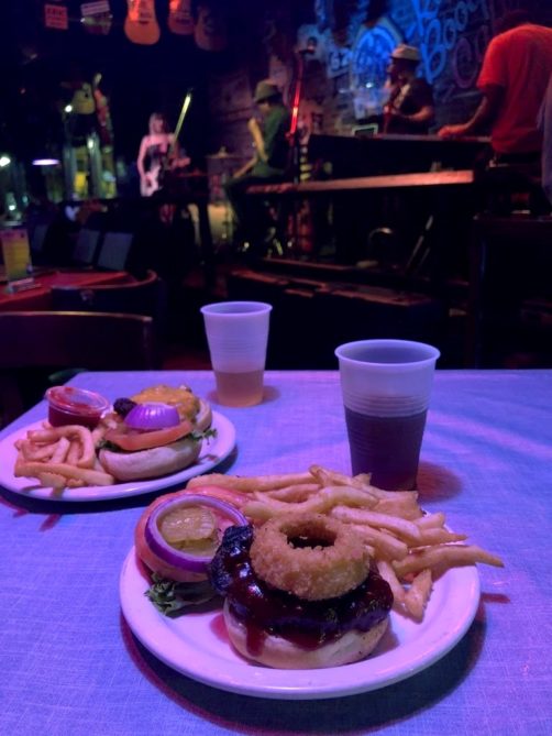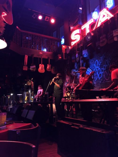 Comme je vous le disais plus haut, après avoir longuement hésité entre les différentes options de Beale Street, nous avons décidé de passer la soirée au Rum Boogie Café car il nous semblait y avoir de l’ambiance sans être trop bondé, et surtout il y avait encore des tables disponibles près de la scène. On a mangé (un bon burger en plus) en regardant le concert du jour qui était vraiment cool (c’était Vince Johnson and the Plantation Allstars… mention spéciale pour ses solos à l’harmonica !).