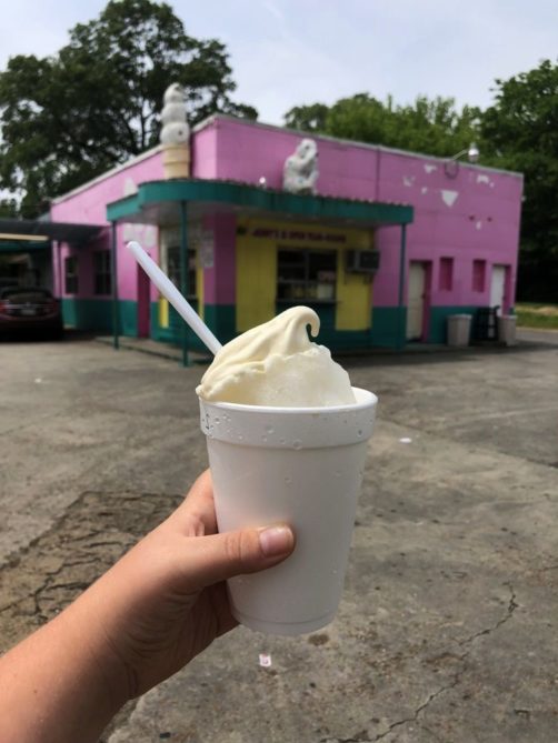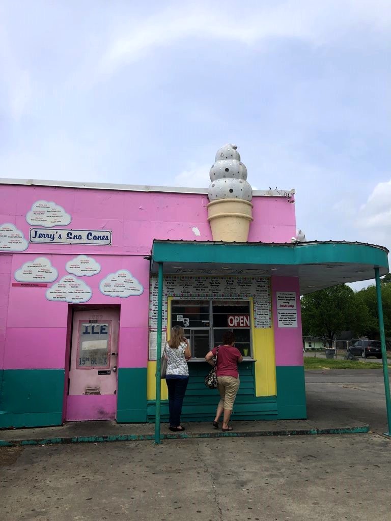 Enfin… on ne pouvait pas quitter la région sans quand même goûter à la spécialité un peu bizarre qu’on retrouve tout le long du fleuve Mississippi, de la Nouvelle-Orléans à Memphis : les « snow cones ». Cette spécialité étrange est un mélange de glace pilée et de lait concentré aromatisé à ce qu’on veut (j’ai pris marshmallow). On peut également rajouter un supplément glace par dessus. Ça arrive rarement, mais c’était tellement sucré qu’on a quasiment tout laissé. Mais au moins, on aura goûté !
