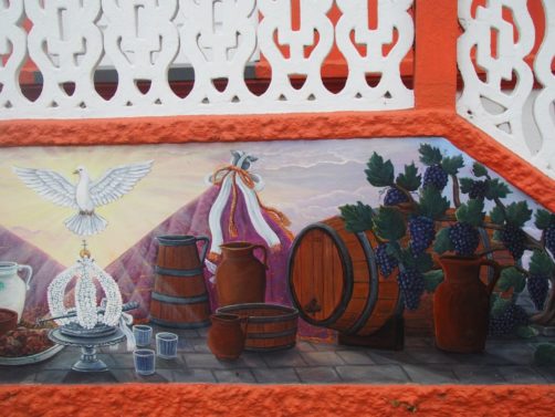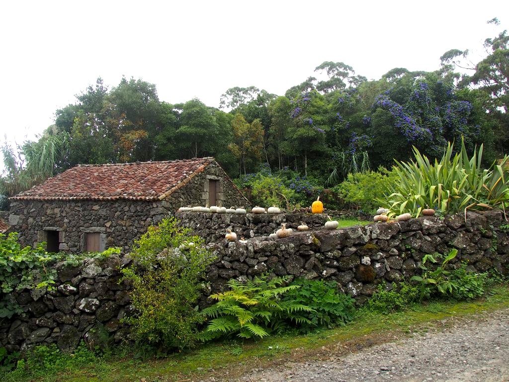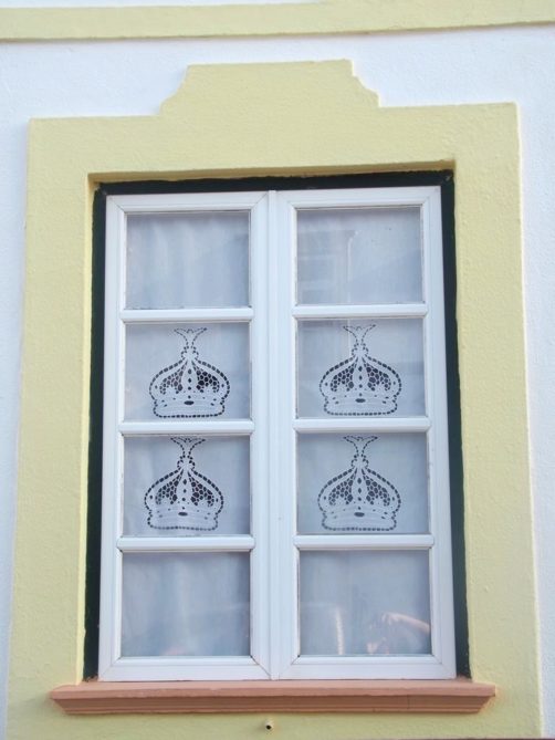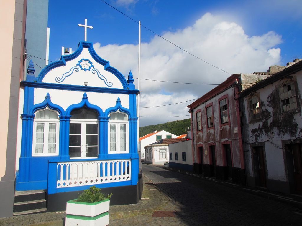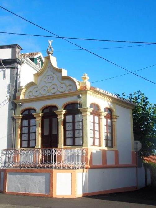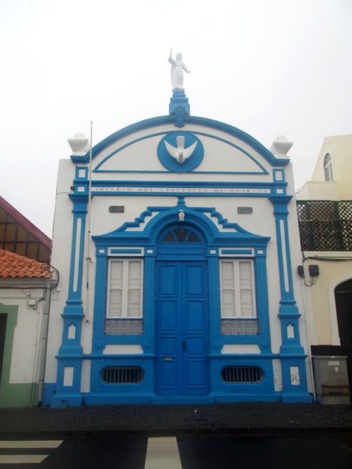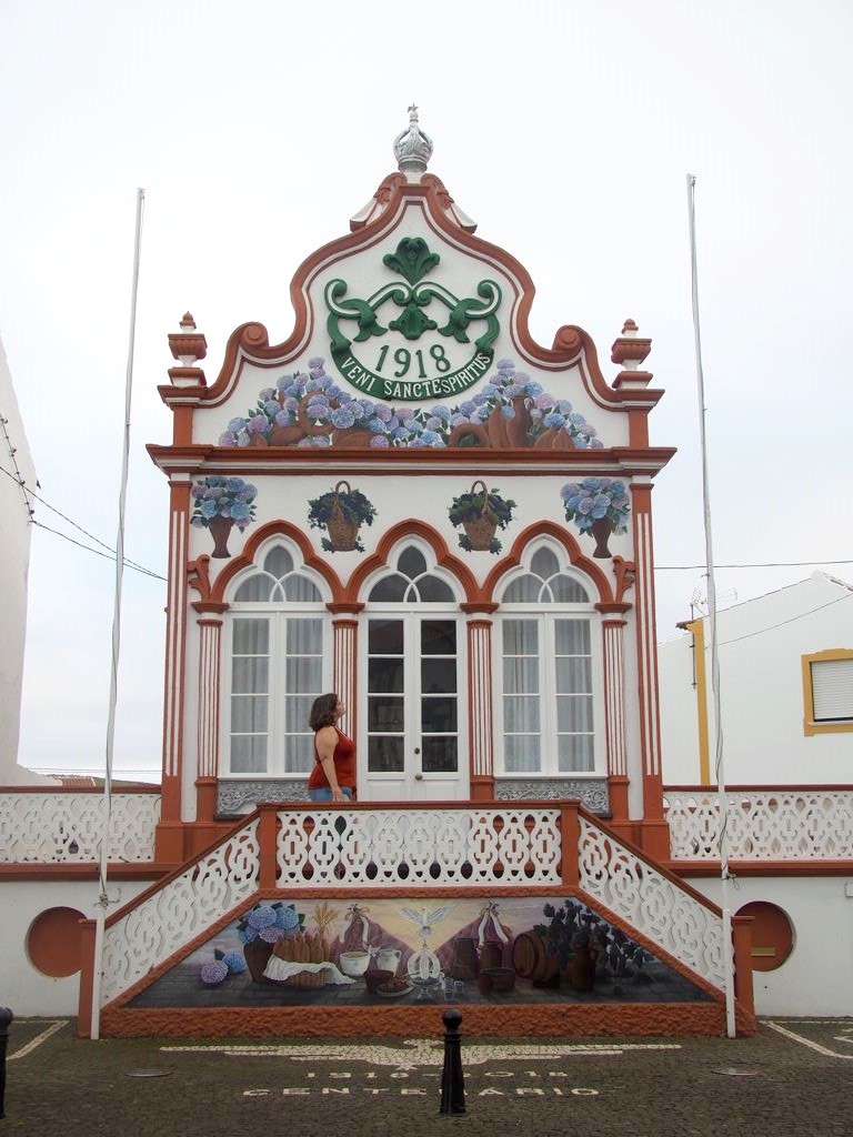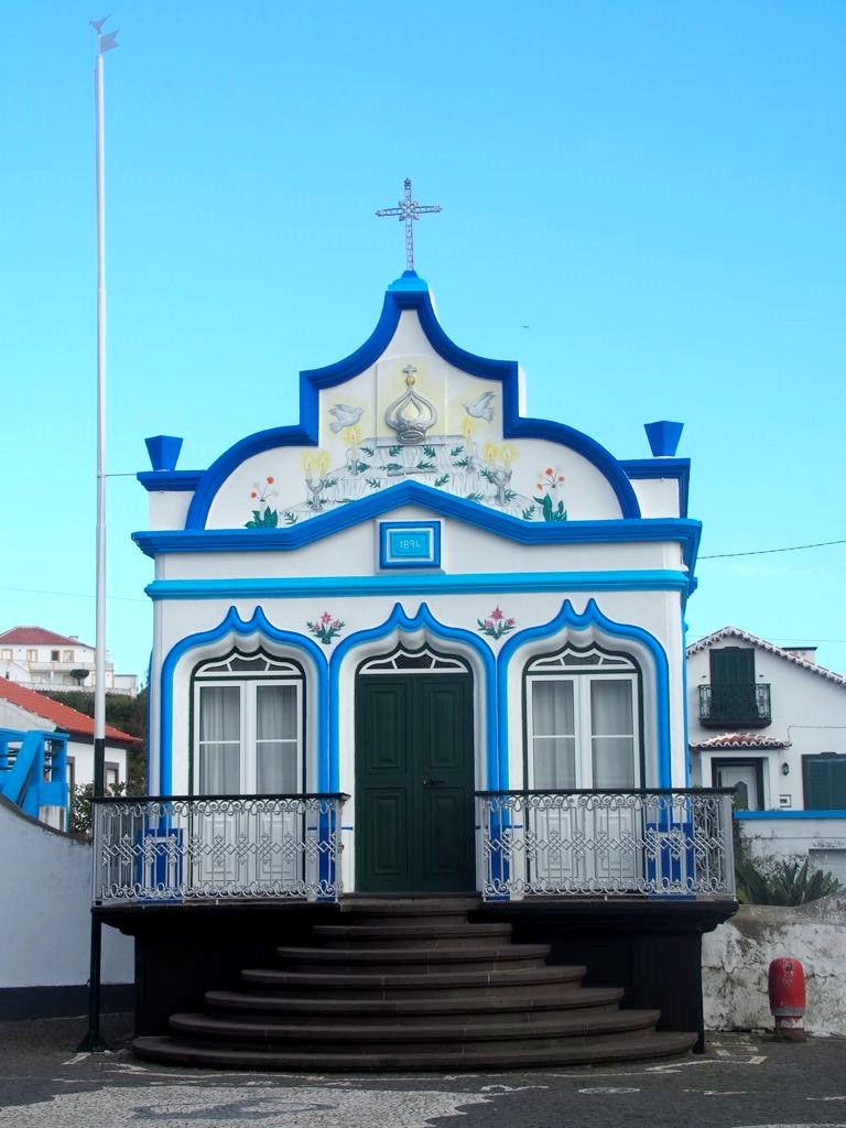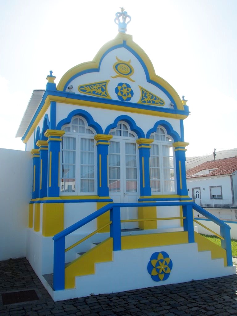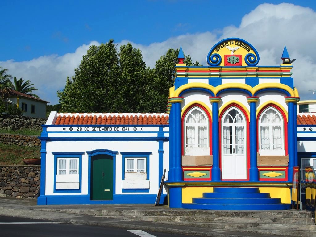 En parcourant l’île de Terceira, vous ne manquerez pas de remarquer dans chaque village des bâtiments colorés, appelés « imperios ». Il s’agit de chapelles dédiées au Saint-Esprit, dont le culte est toujours très présent dans les Açores et en particulier à Terceira, où sont toujours organisées des processions en son honneur à la Pentecôte. Je ne sais pas si celles-ci sont tout aussi hautes en couleur qu’à Tomar, mais les imperios eux le sont en tout cas. Mes préférés : l’Imperio Santo da Caridade à Santa Cruz et l’Imperio Sao Sebastiao dans le village du même nom, avec ses motifs de vignes.