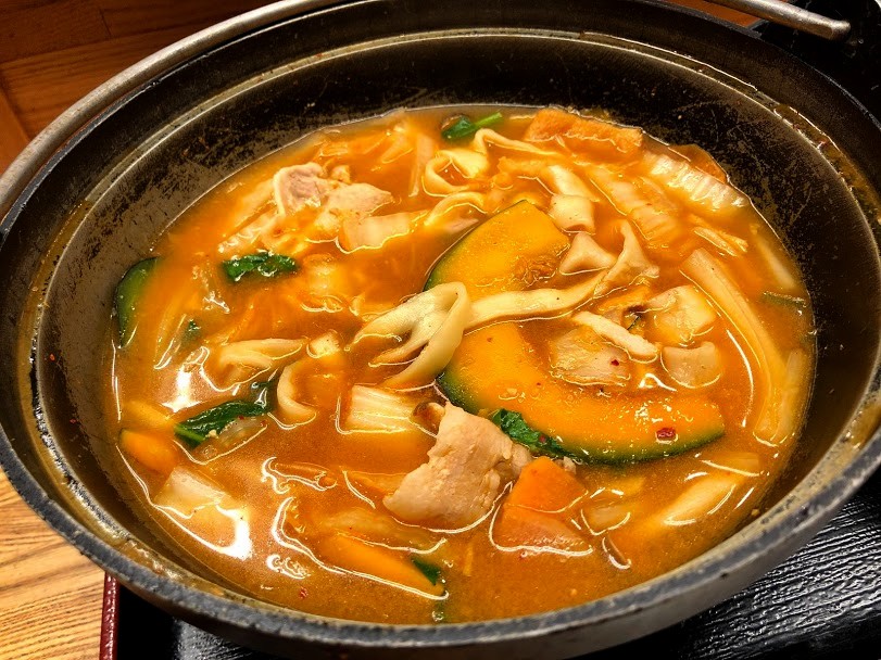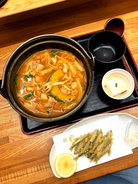 Juste à côté des magasins se trouvait un petit restaurant, Taihou, qui m’avait été conseillé par le propriétaire de l’auberge et où j’ai pu goûter à deux spécialités locales : les petits poissons frits du lac mais surtout le « Houtou Stew« , un genre de ragoût à base de nouilles Udon.