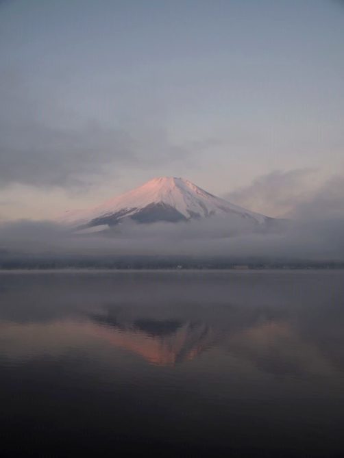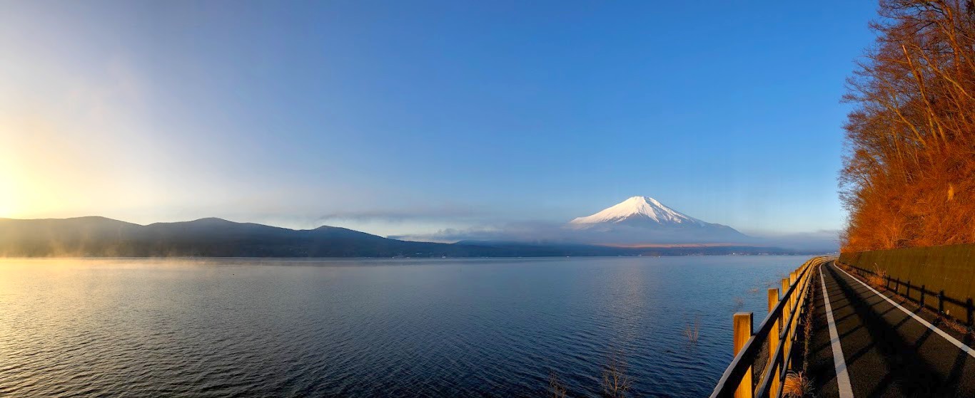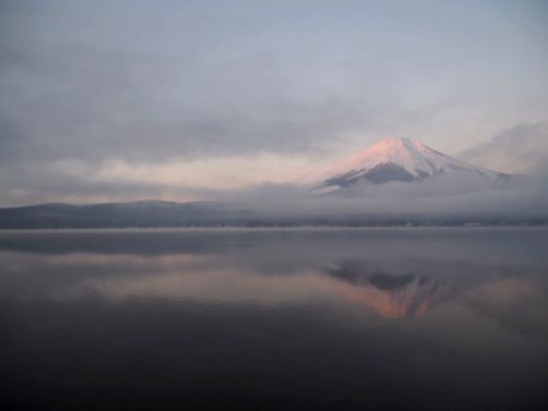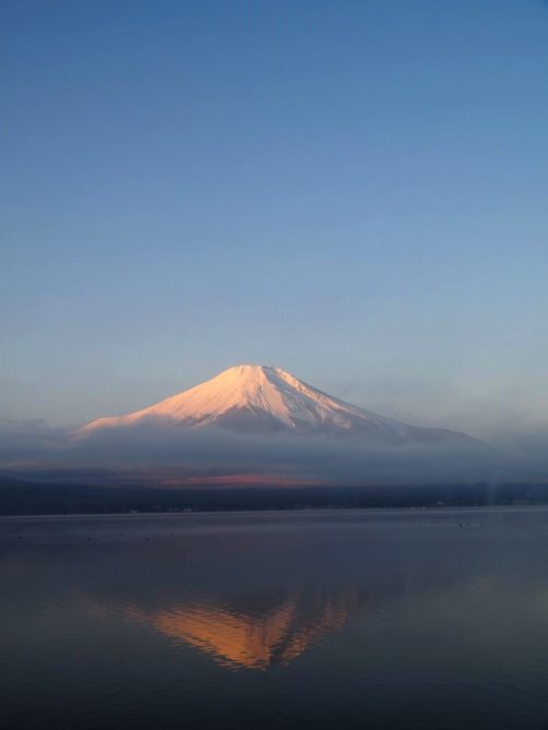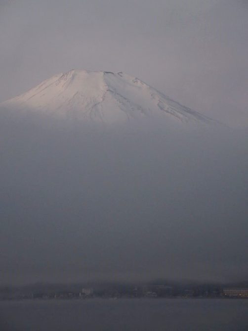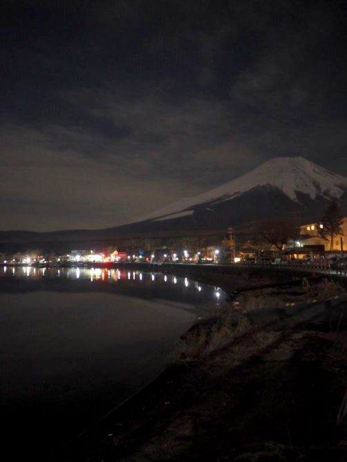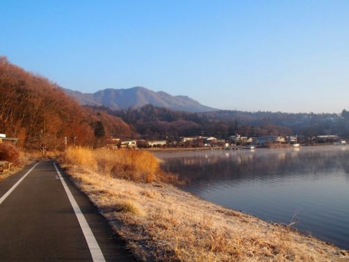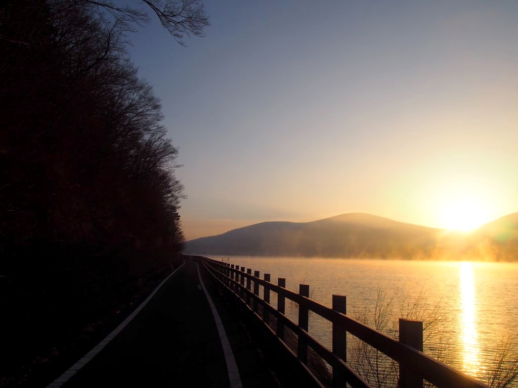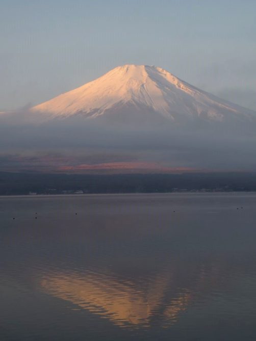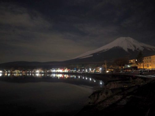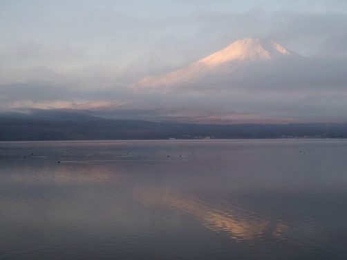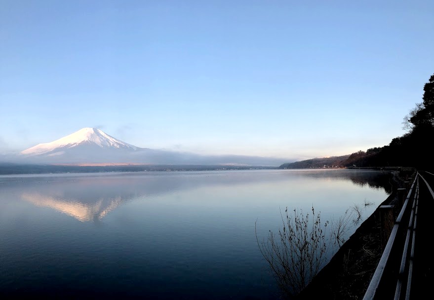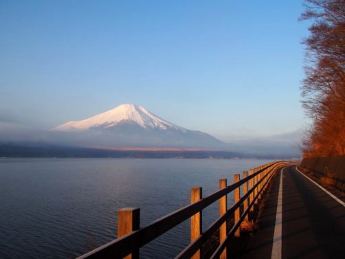Après une courte nuit de sommeil, le lendemain, je me suis levée une nouvelle fois très tôt pour aller voir le lever du soleil sur le mont Fuji depuis les bords du lac. J’avais mis mon réveil à 5 heures, mais j’aurais finalement le mettre encore un peu plus tard car il faisait encore nuit noire à cette heure en plein décembre. Le réveil a piqué, j’ai enfourché le vélo et j’ai entamé dans le noir le tour du lac Yamanakako.