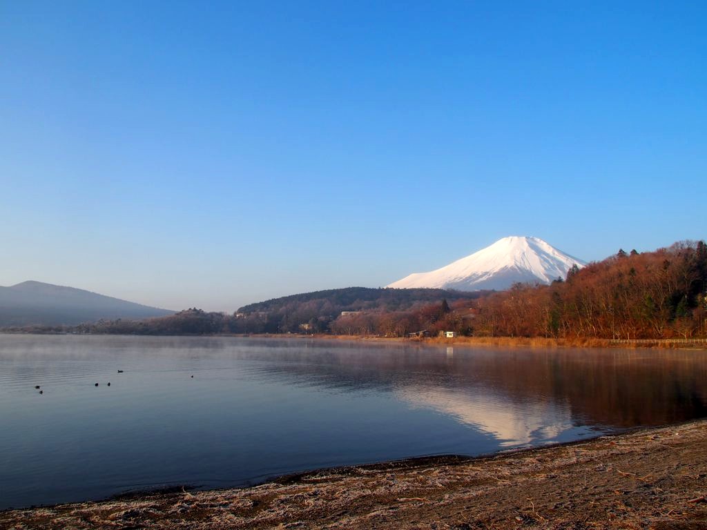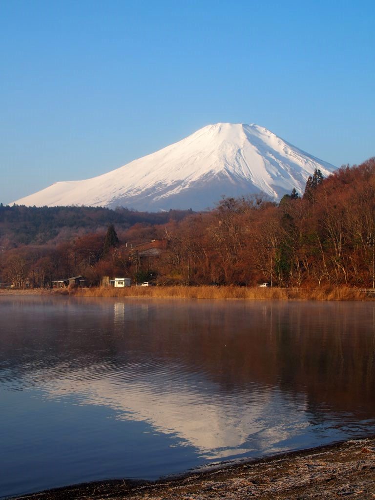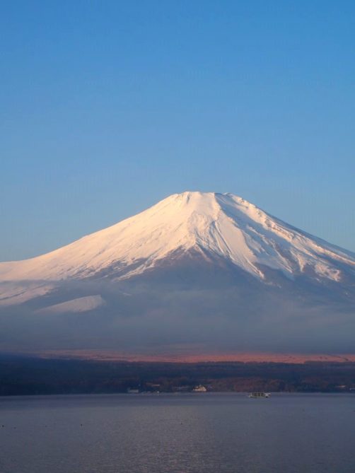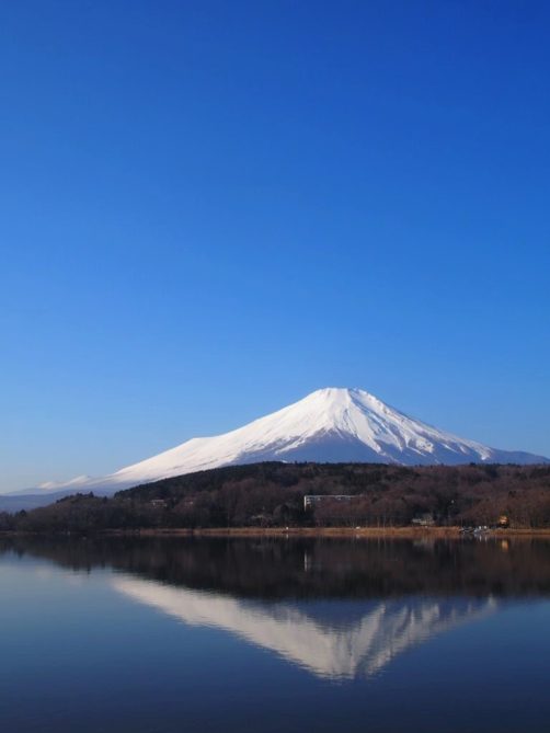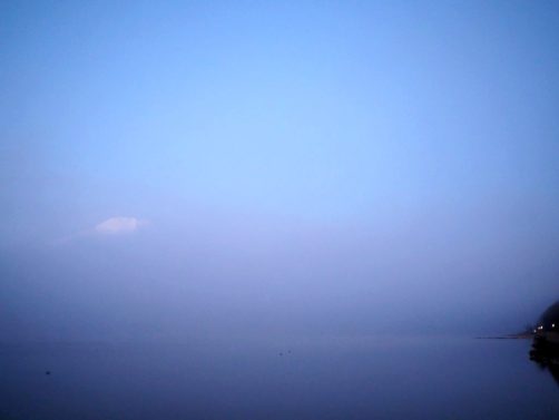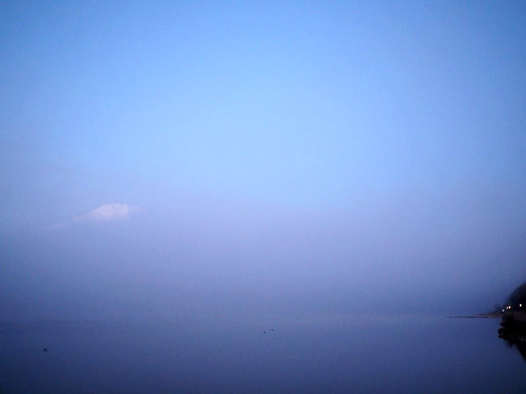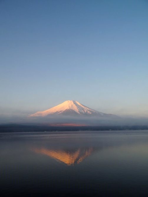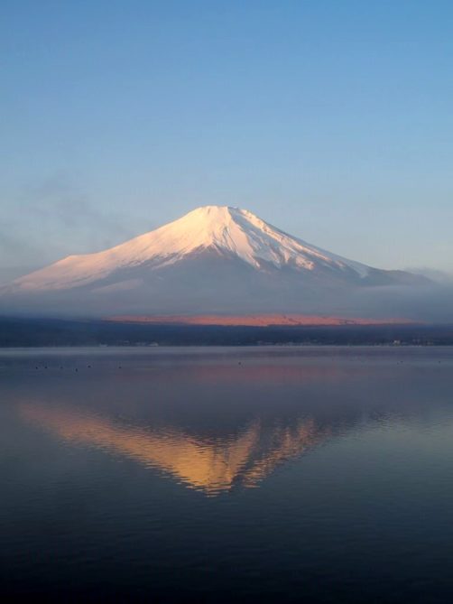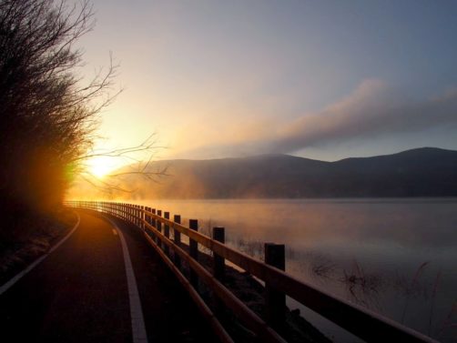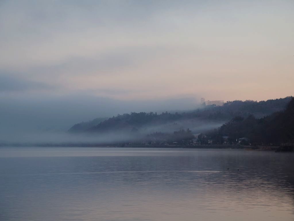 Après une courte nuit de sommeil, le lendemain, je me suis levée une nouvelle fois très tôt pour aller voir le lever du soleil sur le mont Fuji depuis les bords du lac. J’avais mis mon réveil à 5 heures, mais j’aurais finalement le mettre encore un peu plus tard car il faisait encore nuit noire à cette heure en plein décembre. Le réveil a piqué, j’ai enfourché le vélo et j’ai entamé dans le noir le tour du lac Yamanakako.