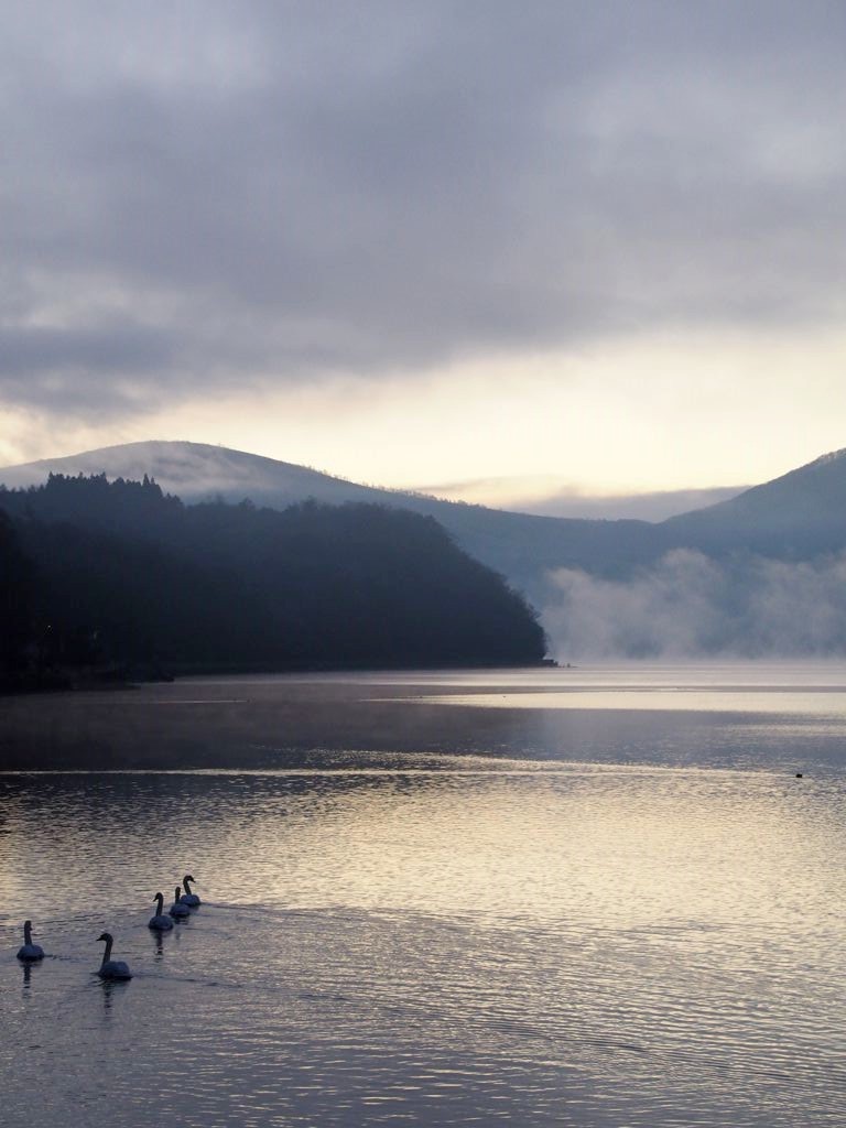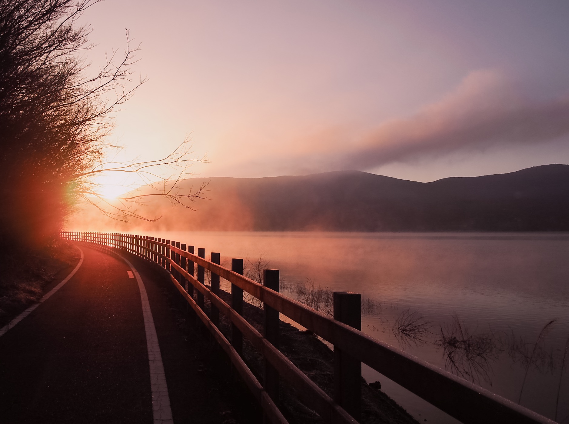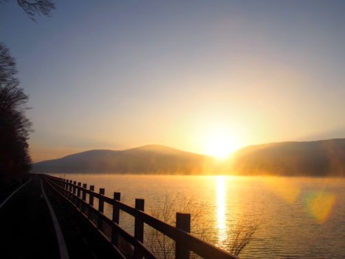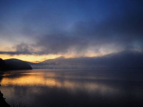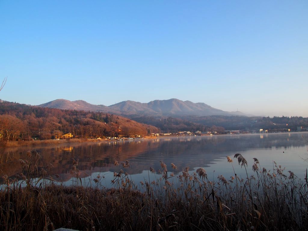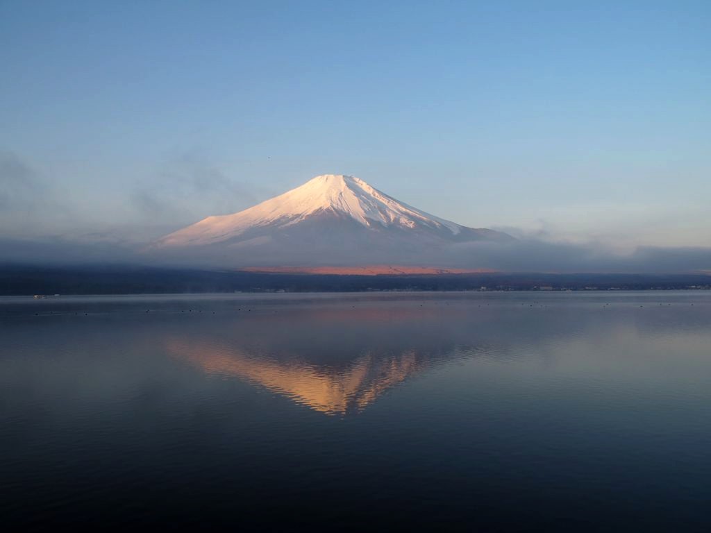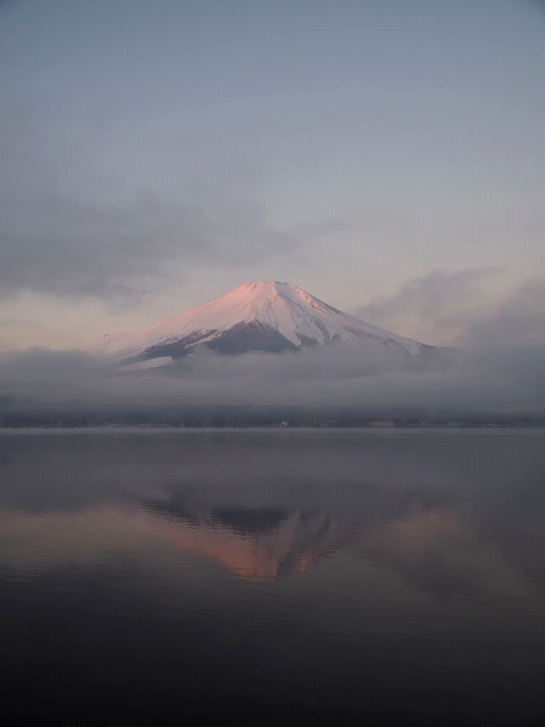 Après une courte nuit de sommeil, le lendemain, je me suis levée une nouvelle fois très tôt pour aller voir le lever du soleil sur le mont Fuji depuis les bords du lac. J’avais mis mon réveil à 5 heures, mais j’aurais finalement le mettre encore un peu plus tard car il faisait encore nuit noire à cette heure en plein décembre. Le réveil a piqué, j’ai enfourché le vélo et j’ai entamé dans le noir le tour du lac Yamanakako.