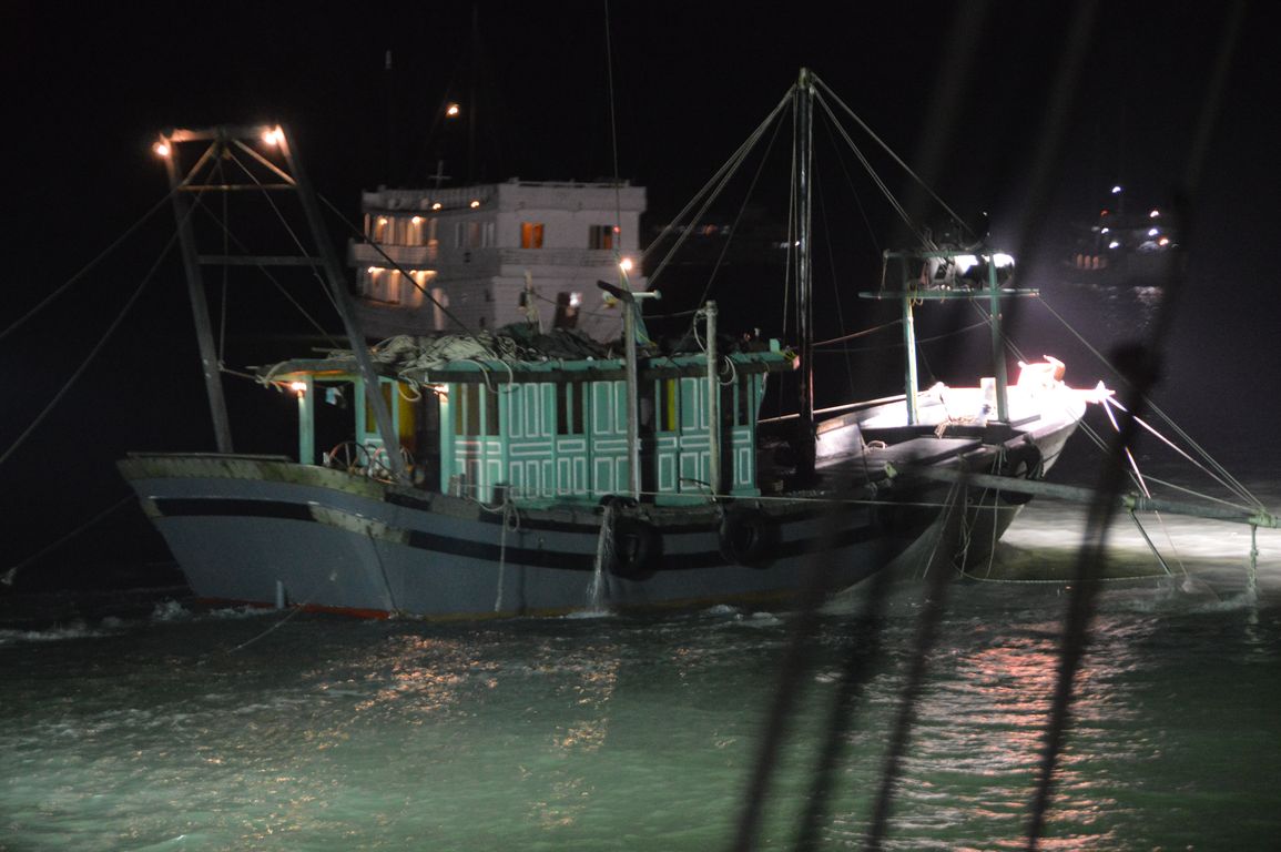 Nouveau temps de repos, et je manque de m’endormir avant le repas du soir. La nuit, toutes les jonques lancent leur ancre dans le même coin, on se sent un peu nombreux mais le spectacle des lumières est encore joli. On assiste également à la pêche nocturne des calamars, dans des bateaux équipés de grandes lampes pour les attirer à la surface!