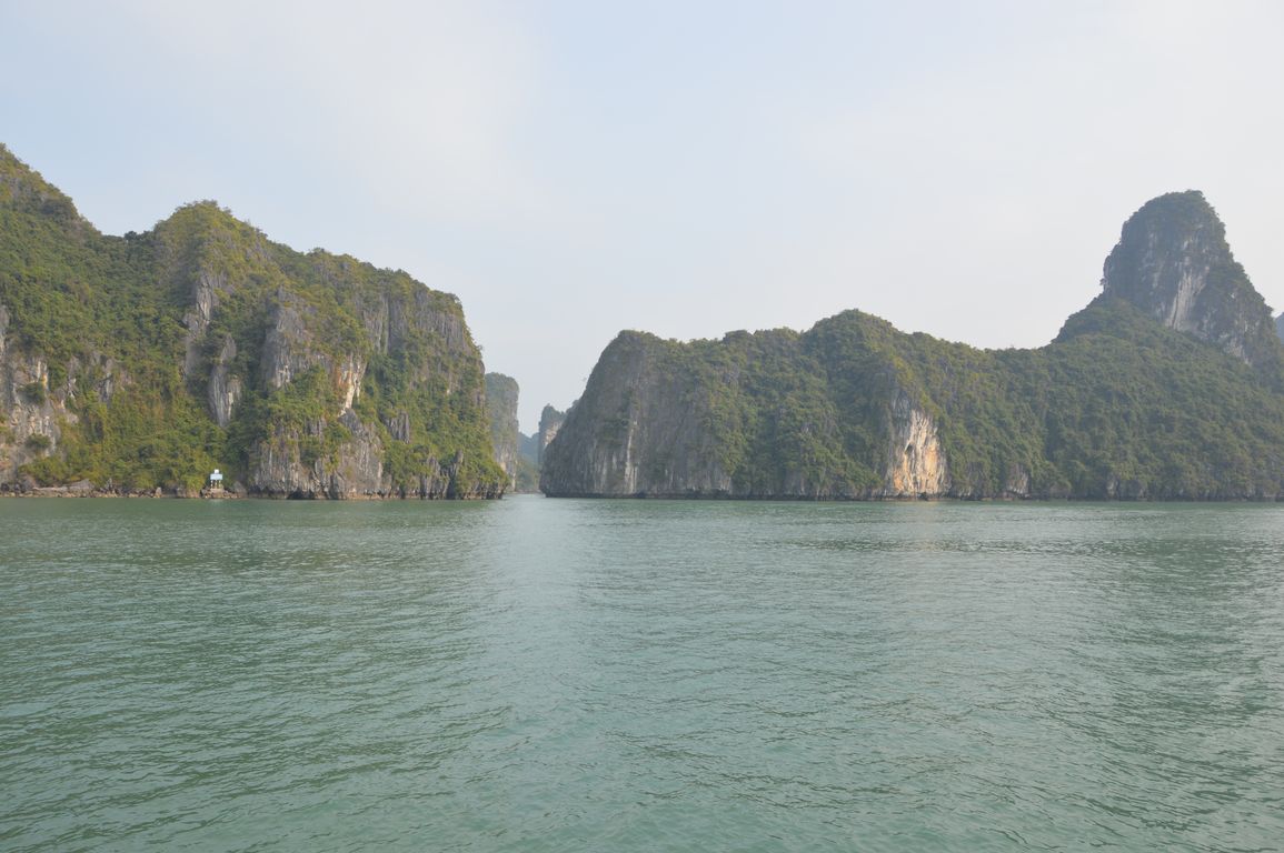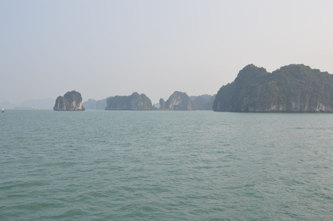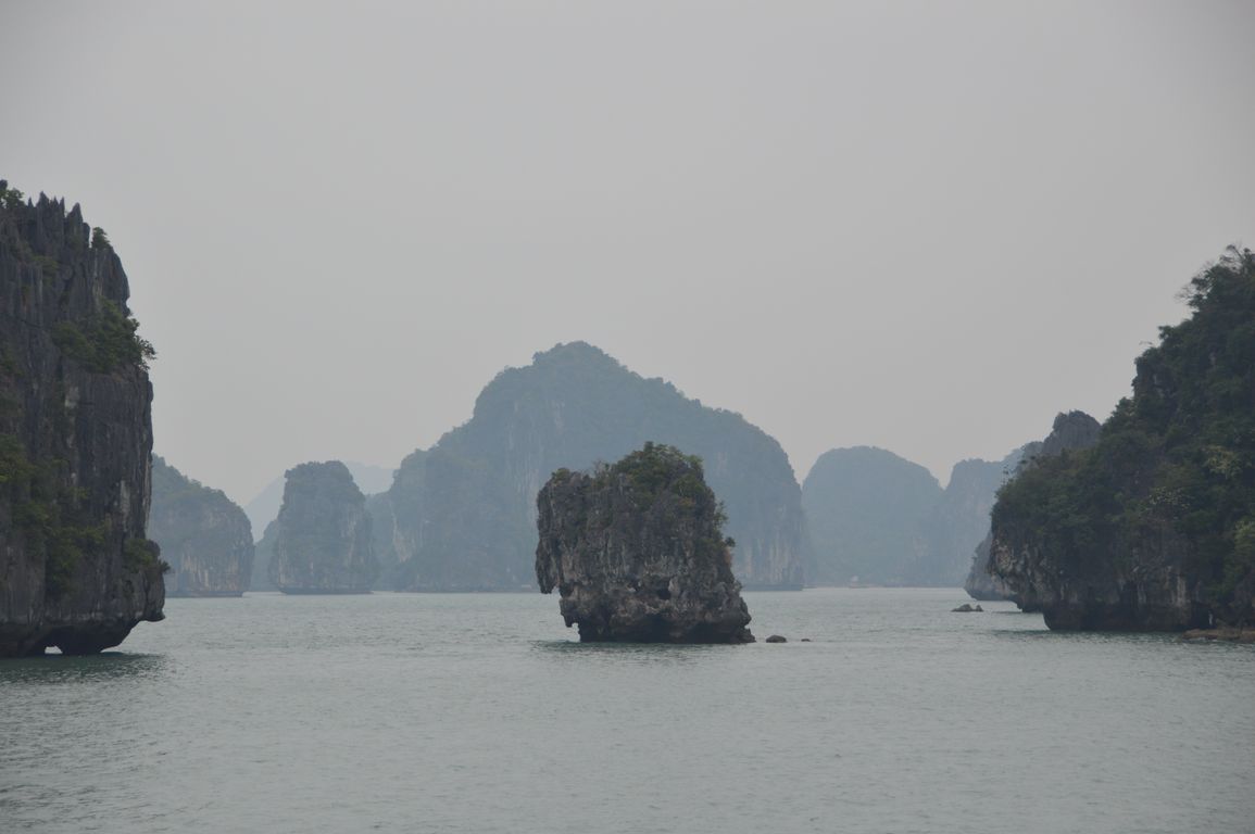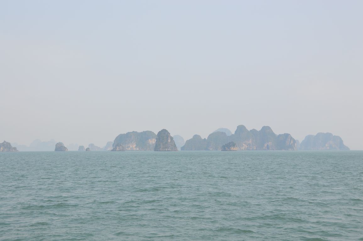 Tout en prenant notre repas de midi accompagné de notre bière à 4$ (à Hanoï pour ce prix là, t’es déjà par terre…), nous commençons à apercevoir les premiers des plus de 1600 îlots que comportent la Baie d’Halong émerger de l’eau.