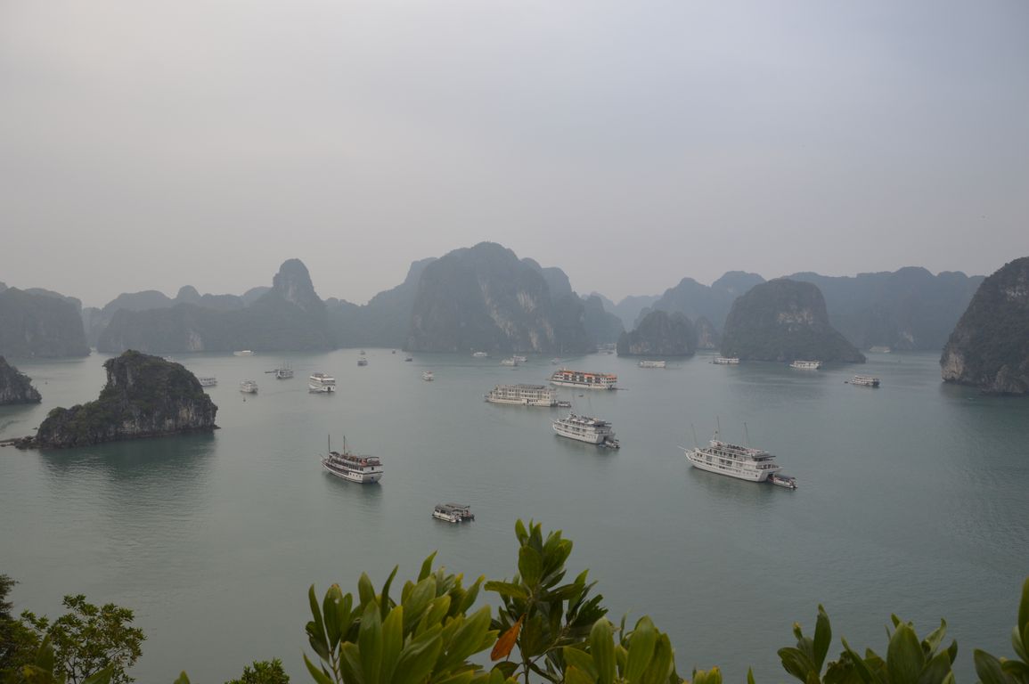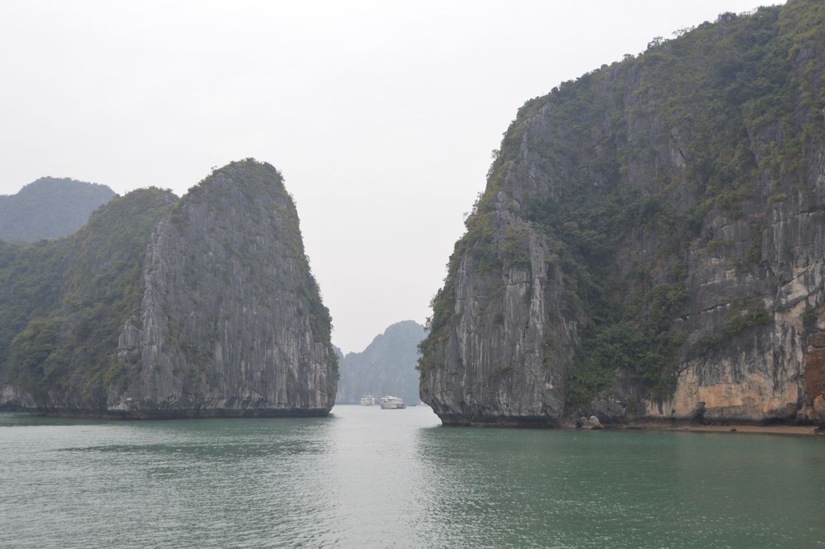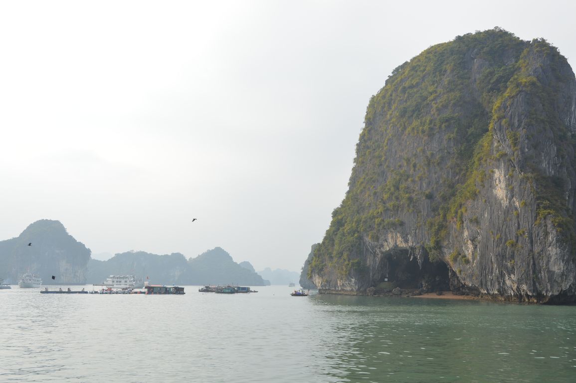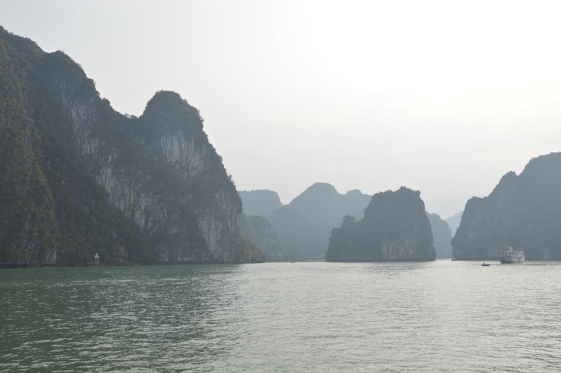 Tout en prenant notre repas de midi accompagné de notre bière à 4$ (à Hanoï pour ce prix là, t’es déjà par terre…), nous commençons à apercevoir les premiers des plus de 1600 îlots que comportent la Baie d’Halong émerger de l’eau.