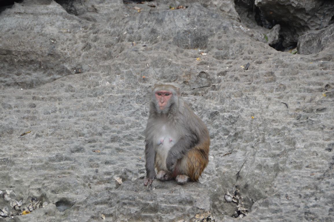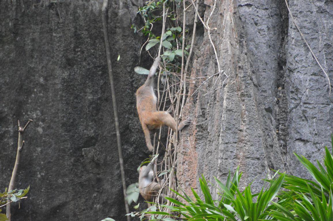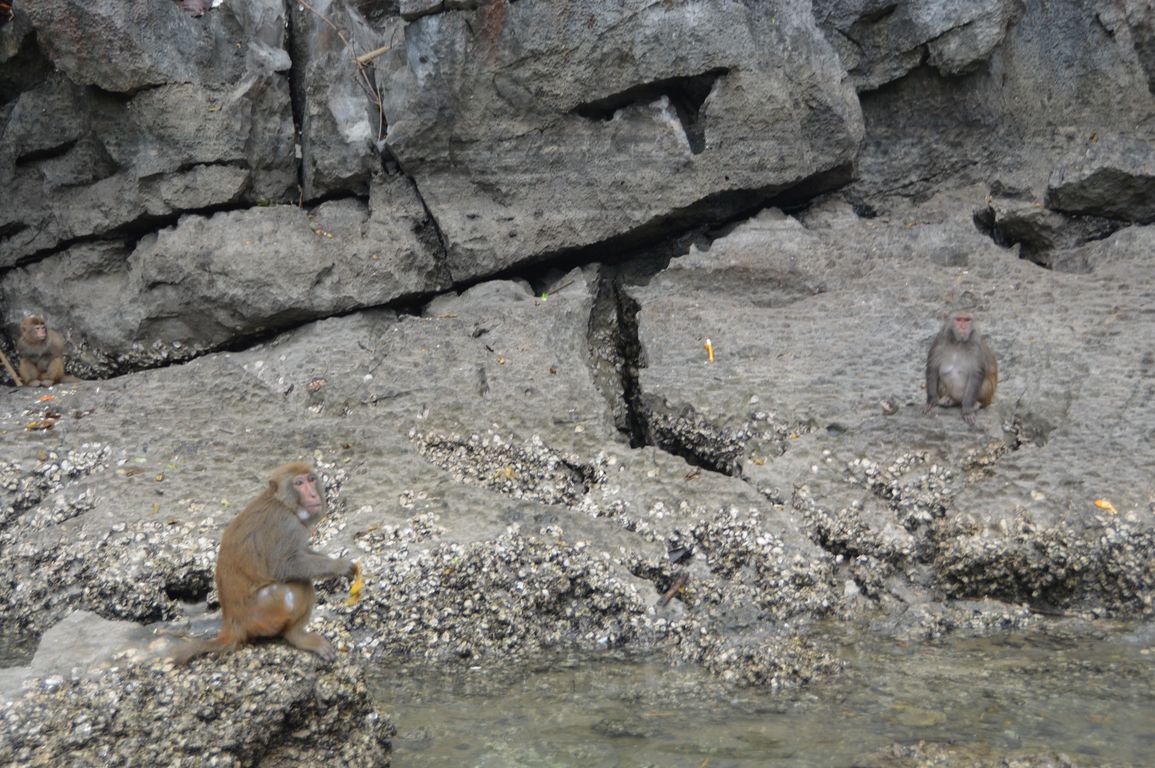 Après un petit déjeuner très matinal, nous embarquons pour la dernière visite, Hang Luôn, une grotte palatine et un lac fermé où abondent les singes sauvages l’hiver: n’ayant pas assez de fruits en haut des îlots, ils descendent dire bonjour aux touristes pour recevoir des bananes!
