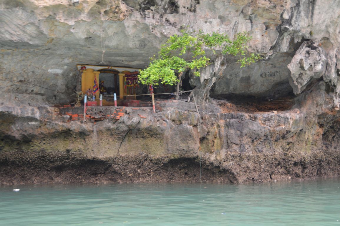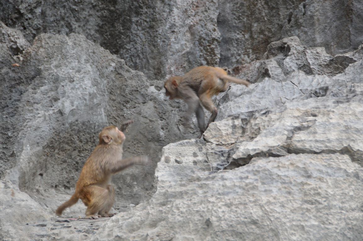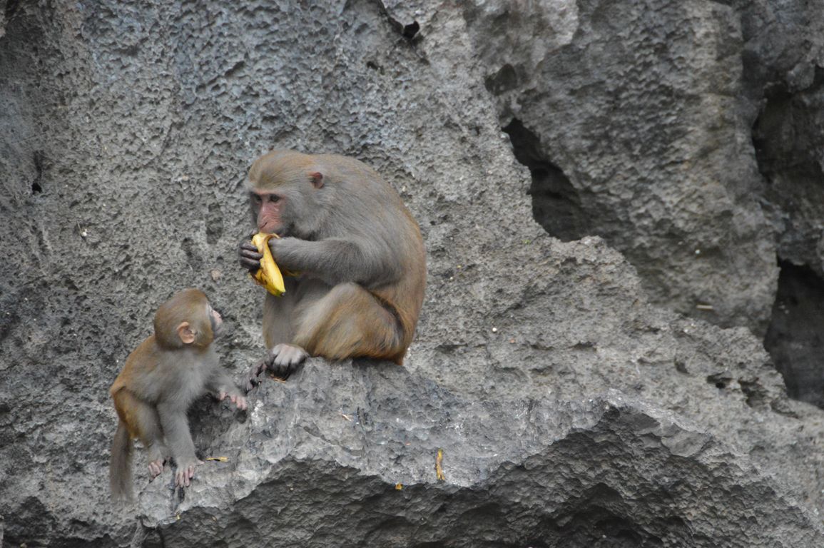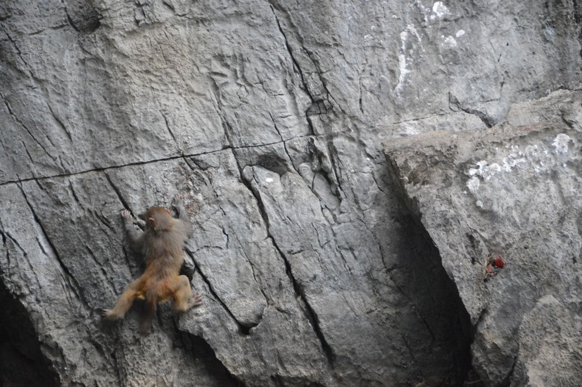 Après un petit déjeuner très matinal, nous embarquons pour la dernière visite, Hang Luôn, une grotte palatine et un lac fermé où abondent les singes sauvages l’hiver: n’ayant pas assez de fruits en haut des îlots, ils descendent dire bonjour aux touristes pour recevoir des bananes!