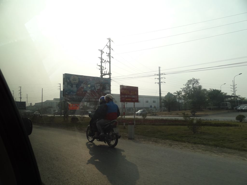 Côté décor, nous sommes en janvier donc ce n’est malheureusement pas la saison du riz (rizières vides), Fred se console en essayant de photographier les milliers de posters de propagande communiste et les drapeaux vietnamiens et communistes qu’on rencontre sur la route (pas super évident quand on a un chauffeur qui conduit comme un fou…).