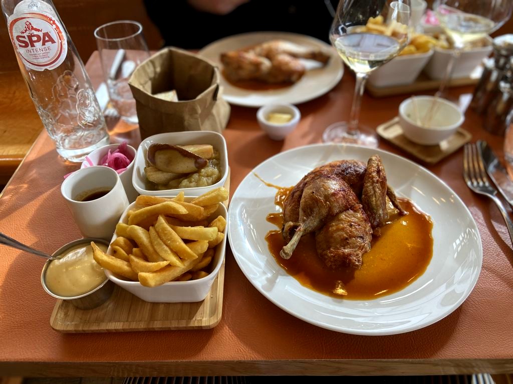 Côté rôtisserie, que du bon également, avec du poulet fermier élevé en plein air proposé de trois façons, pour que chacun y retrouve son compte (et selon les saisons) : poulet « à la brabançonne » (Chicon fine Champagne et pomme de terre purée), « à la Sambre & Meuse » (carottes Vichy et pommes de terre frites), et enfin le grand classique pour lequel nous avons craqué, le poulet « aux pommes fruits », avec jus tranché et pommes de terre frites. Un véritable régal : un poulet croustillant accompagné d’un jus bien gourmand, véritable retour en enfance, avec un petit bémol cependant pour les frites un peu sèches.