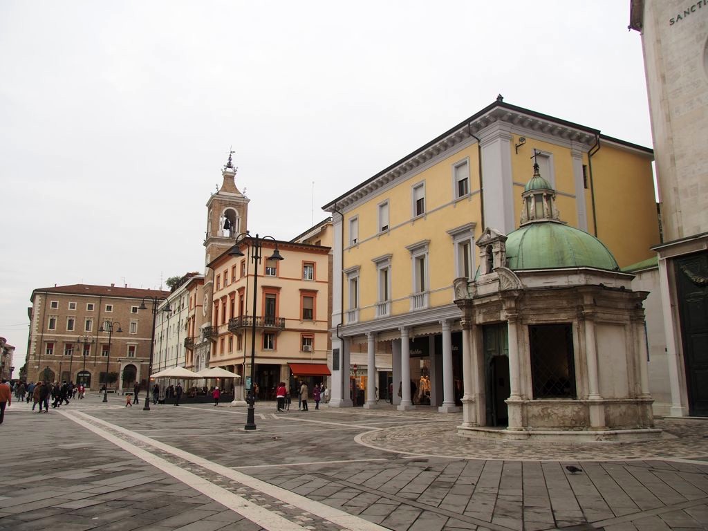 A l’emplacement de la Piazza Tre Martiri se trouvait l’ancien forum romain, et donc le centre antique de Rimini. Une statue à la mémoire de Jules César commémore le fait que c’est ici qu’il se serait arrêté après avoir traversé le Rubicon.