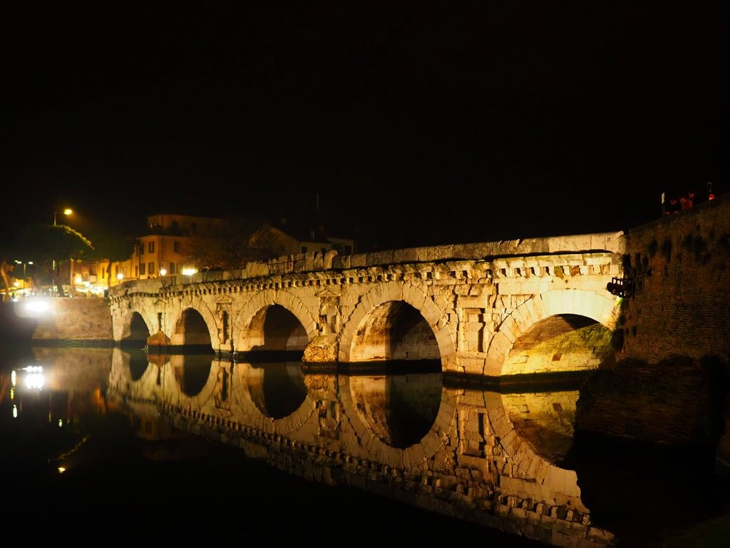 A la sortie du Borgo, je vous propose de franchir le franchir le fameux Ponte di Tiberio, un pont romain construit il y a plus de 2000 ans ! Il constituait à l’époque le début d’une chaussée romaine, la Via Emilia. La nuit, tout éclairé, le pont est encore plus charmant.