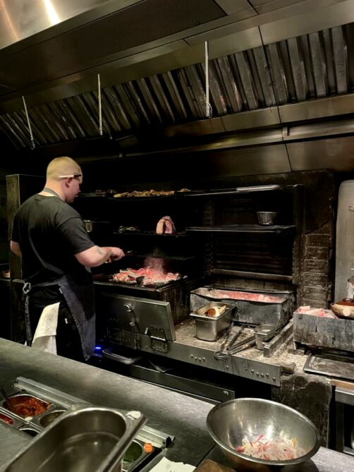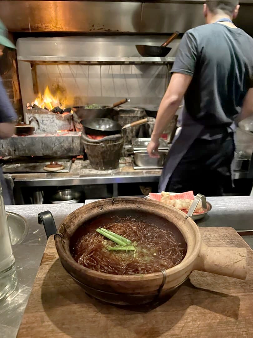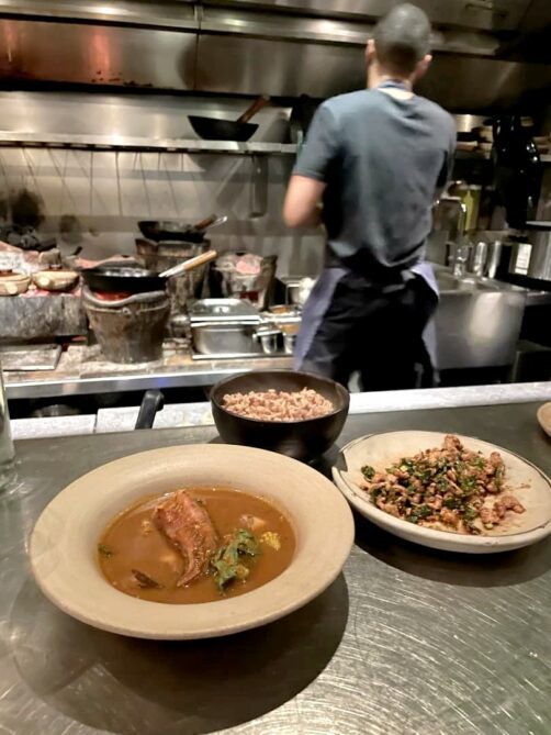Kiln est l’une des adresses de cuisine du monde les plus populaire du West End (à Soho). Ce grill thaïlandais ne prend de réservation que pour sa salle du bas (complète longtemps à l’avance, en général) et c’est premier arrivé, premier servi pour le grand comptoir du haut (qui est clairement le meilleur endroit pour observer les chefs à l’oeuvre !). On s’était dit qu’en arrivant un peu après 16h, un jour de semaine en décembre, il ne faudrait pas faire la file : au final, on a quand même du attendre 45 minutes !