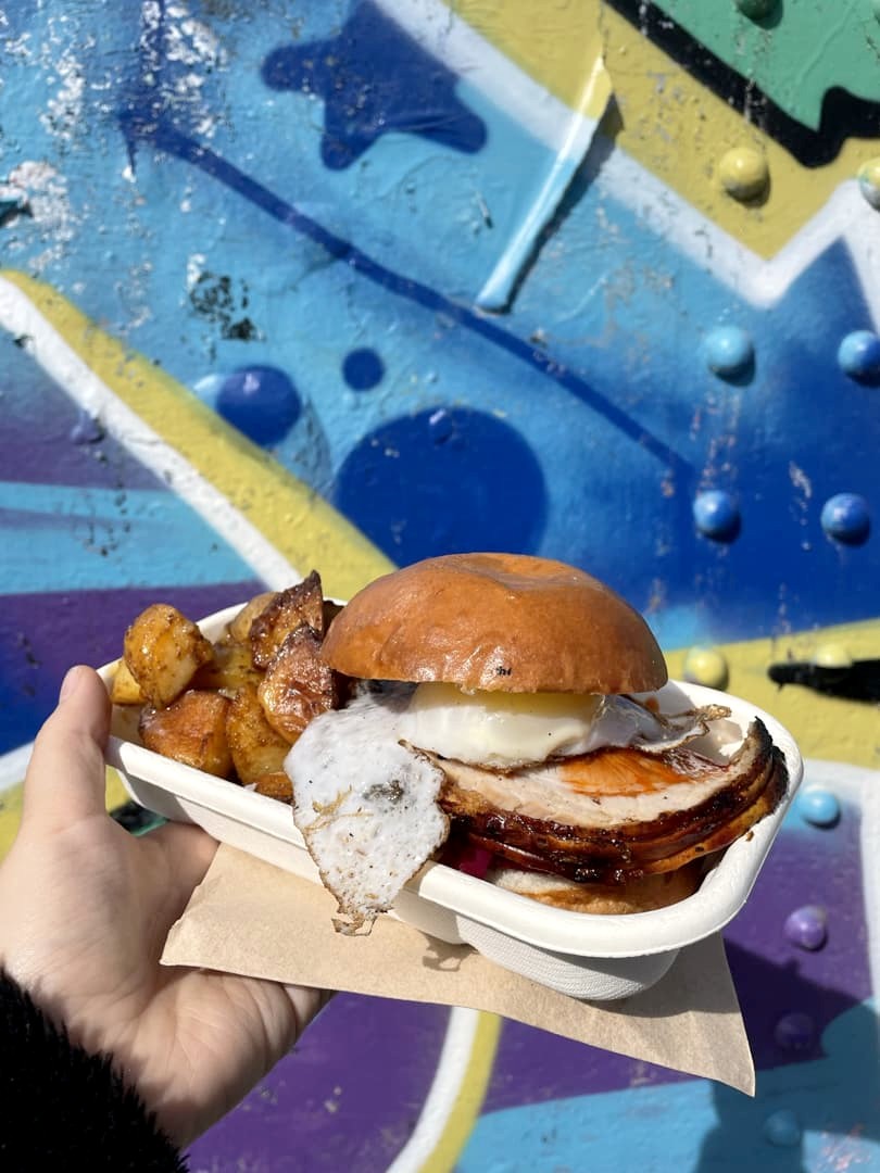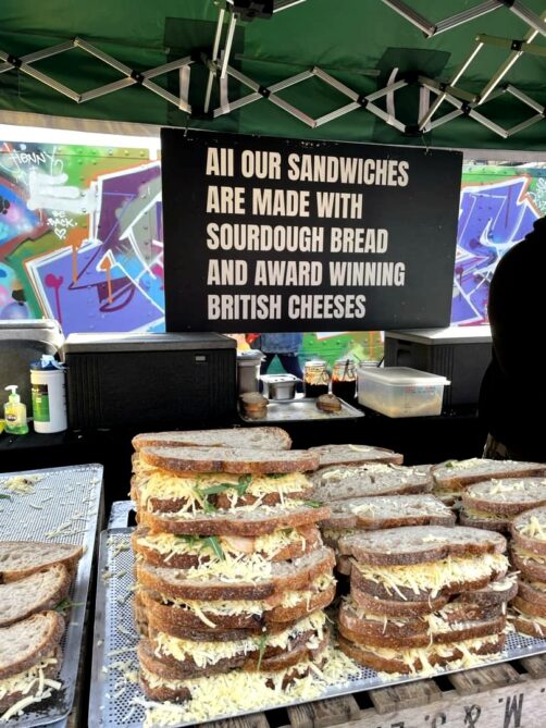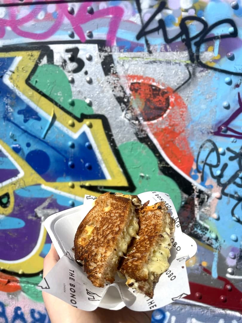 Si vous êtes à Londres un dimanche, n’hésitez pas à prendre la direction de Brick Lane pour profiter de l’ambiance du Brick Lane Market. Vous y trouverez des options variées de street food, de très bonne qualité. On y a notamment goûté un sandwich au rôti de porc inoubliable, ou encore un croque-monsieur (« grilled cheese ») au pain au levain et fromages locaux à tomber. A côté de la partie food, il y a aussi une grande section de vêtements vintage.