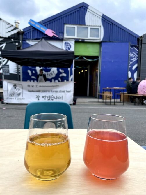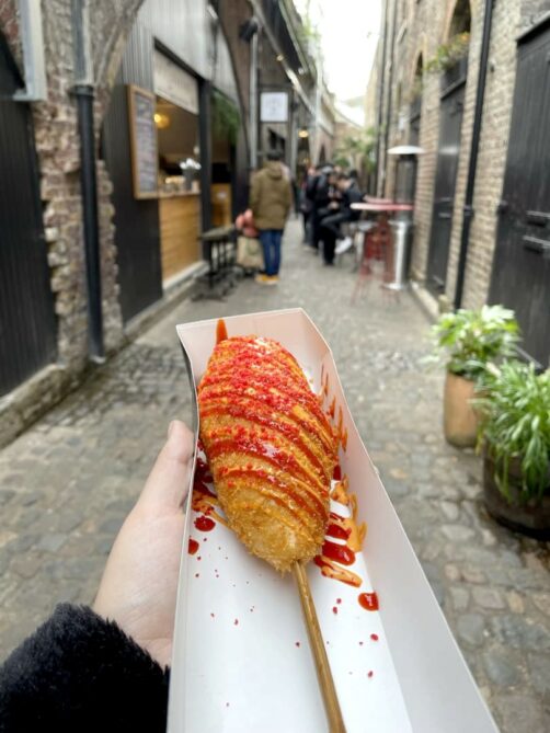 Lors de ma dernière visite, j’ai testé l’une des adresses actuellement les plus populaires du marché : U K-Dogs n Juicy, qui sert de copieux corn dogs à la coréenne. Très bon mais un peu cher.