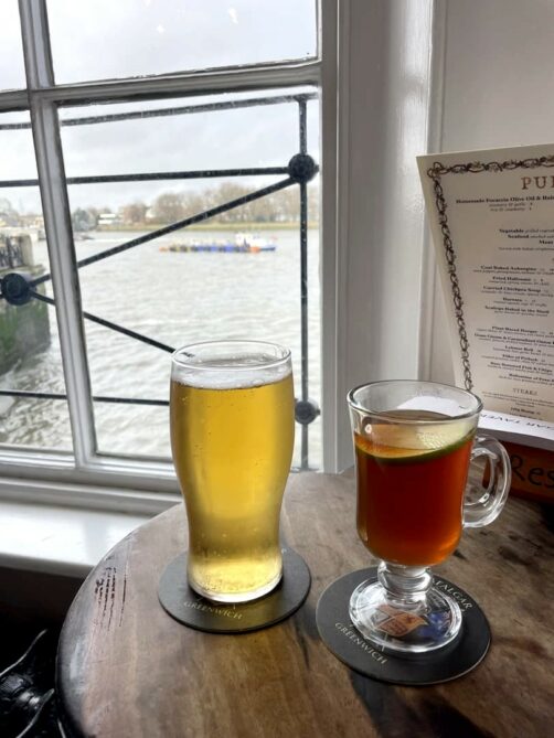 Il est toujours possible d’y manger, mais on profite déjà très bien de l’ambiance avec juste un petit verre, à l’intérieur parmi la collection d’oeuvre d’art (et avec un « hot cider » en main) l’hiver, ou sur la grande terrasse sur les bords de la Tamise durant la belle saison.