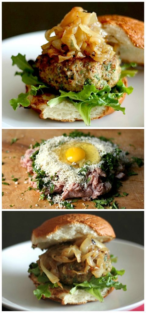 In a large bowl combine all of the ingredients (minus the burger buns!) and mix well with hands. Divide meat mixture into 4 even balls, and lightly pat them into round patties. Heat a large skillet over a medium high flame and cook burgers on each side for 4-5 minutes, or until the middle is no longer pink (I usually cut into one of the burgers right around the 8 minute mark to check). Place cooked burgers on buns, and top with caramelized onions. Serve right away.