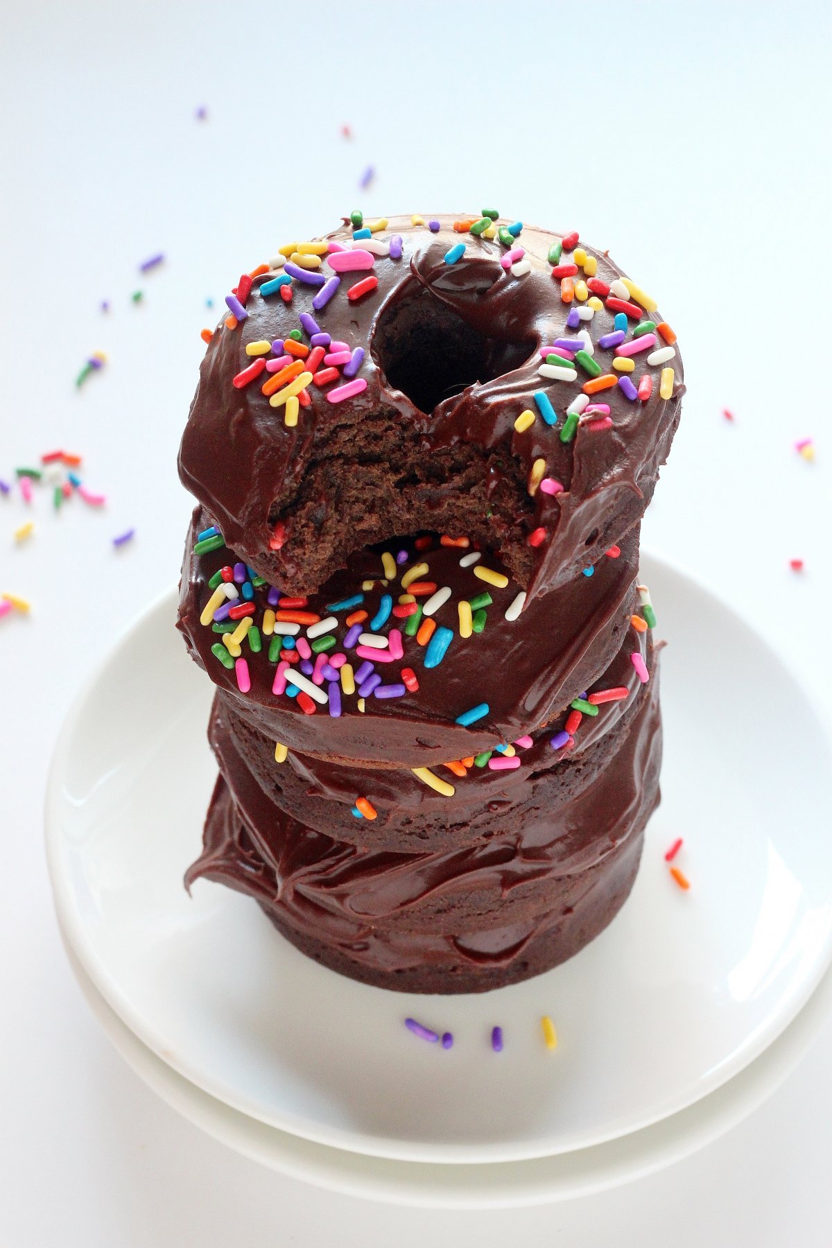 Baked – not fried – these double chocolate cake donuts are topped with a thick, creamy chocolate ganache frosting and rainbow sprinkles!Â