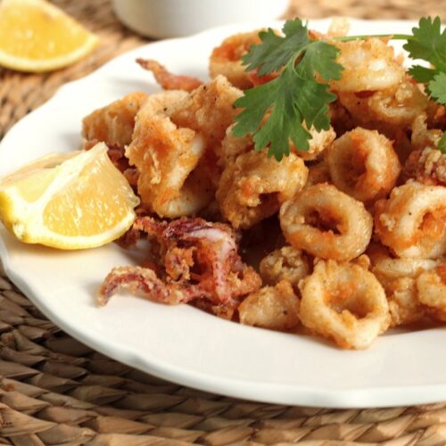 I love ordering fried calamari when we eat out, but I have to admit, it’s one of those things I’ve always feared doing myself at home. This is mainly because I HATE frying; it scares the heck out of me. But also, buying squid just seems… intimidating. Is that weird? Maybe I have fish issues…