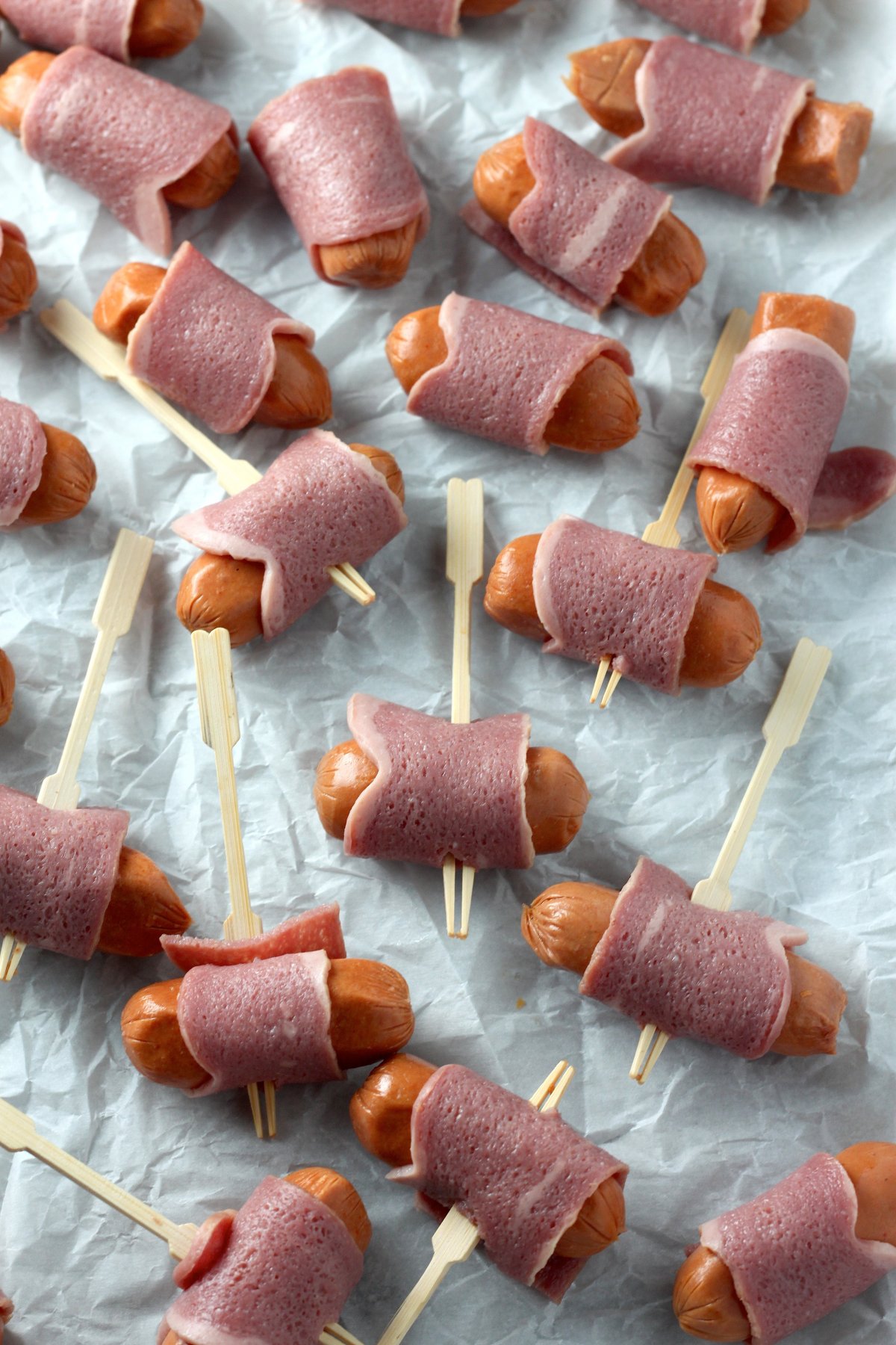 The first step to getting your little smokie on is wrapping each little sausage/hot dog link with a piece of bacon. I’ve made these with pork bacon and turkey bacon, and although the pork variety crisps up a little better (thank you, bacon fat), the recipe with work fine with either.