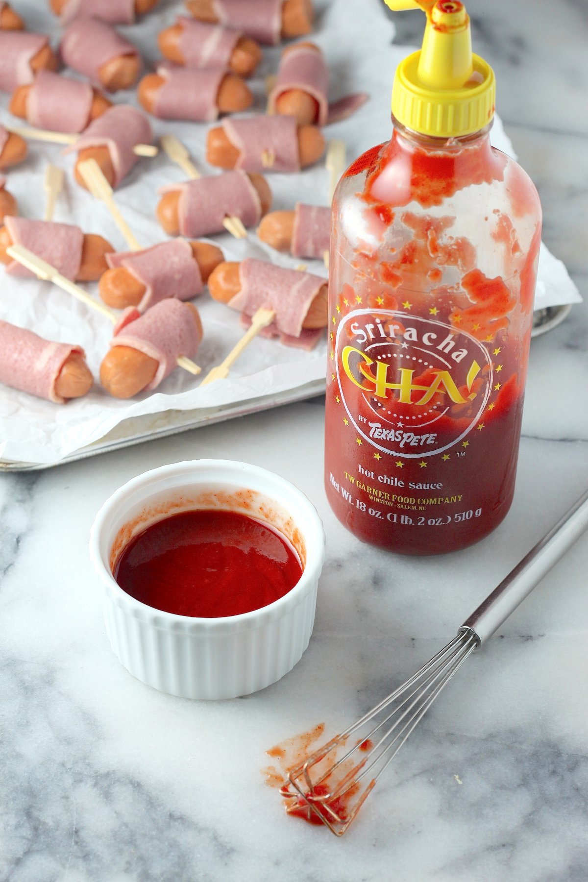 - In a small bowl combine sriracha and maple syrup. Slather each bacon wrapped dog with Sriracha maple sauce.