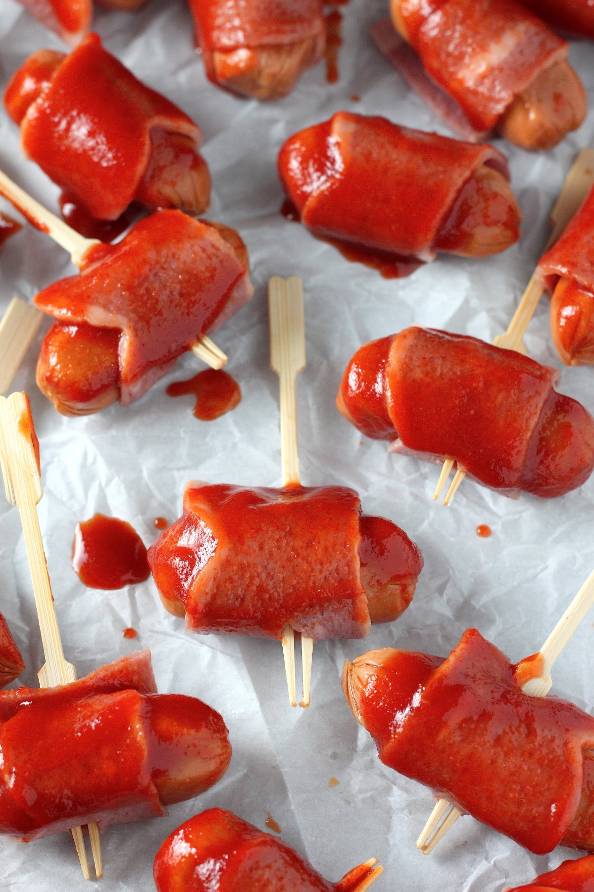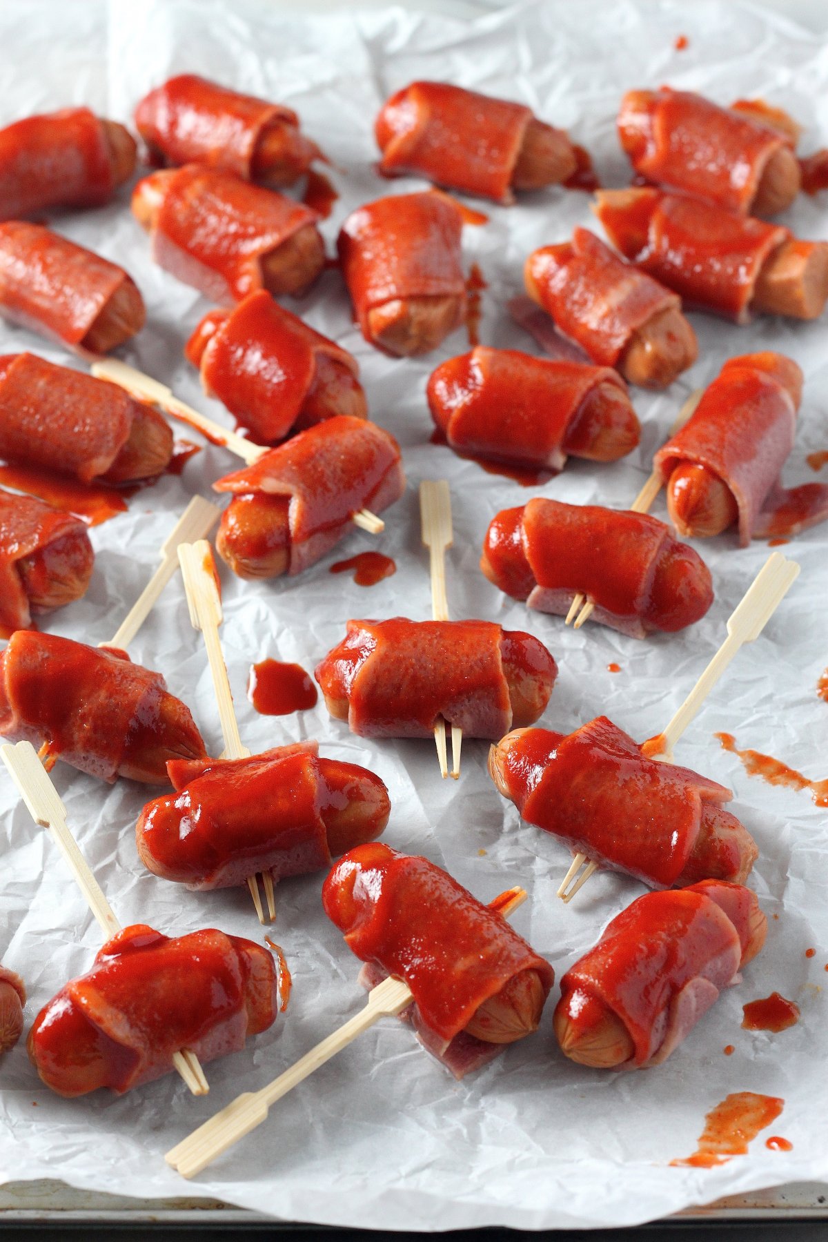 I should warn you now that these Bacon Wrapped Maple Sriracha Little Smokies are SPICY. Sriracha has a great kick of heat! It does get a kiss of sweetness from the addition of maple syrup, but on the grand scale of things, this recipe is definitely more spicy than sweet. If you’re making these for a party I would suggest making half with a lot of sauce (for the spice lovers) and half with just a brush of sauce (for the wimps… er, I mean, faint of heart). This way everyone wins! Little smokies for all. Hooray!