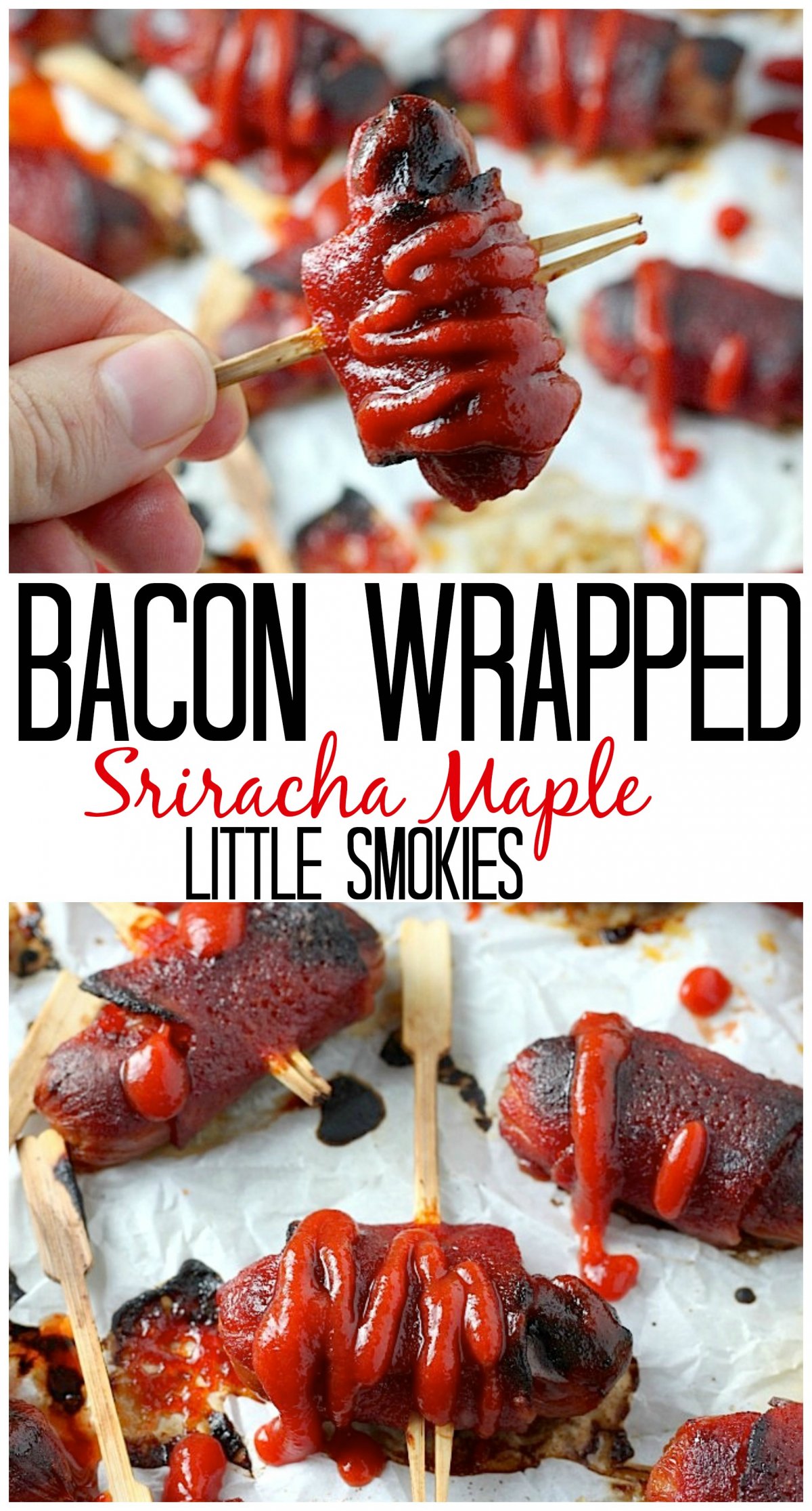 Raise your hand if you’re ready for a super easy, super spicy, super addictive appetizer recipe! Little tiny sausages are wrapped with bacon, brushed with spicy maple sriracha sauce, and baked until nice and crispy. This recipe is a total keeper!