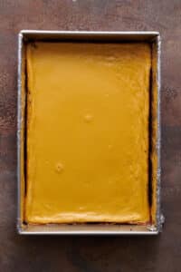 - Prep the Crust: Press the crust down firmly into a 9×13-inch baking pan line with parchment paper or foil. Pre-bake for 10 minutes.