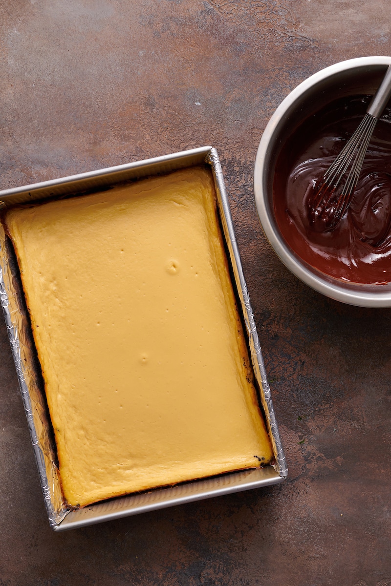 - Pour the ganache over cooled cheesecake. Set aside until the ganache is set but still creamy, about 1 hour.