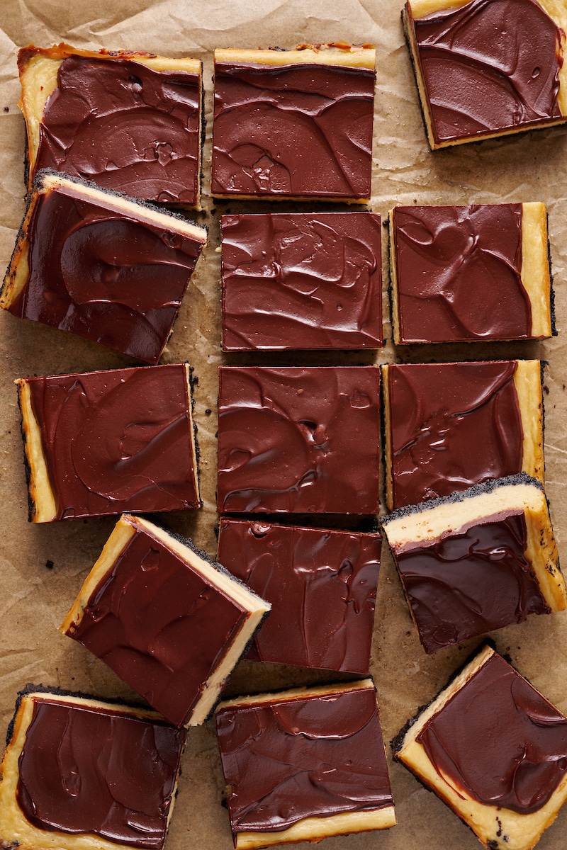 - Garnish: Top chilled cheesecake bars with chocolate ganache and let the ganache firm up for about 1 hour. You can speed this up by popping them back in the fridge.