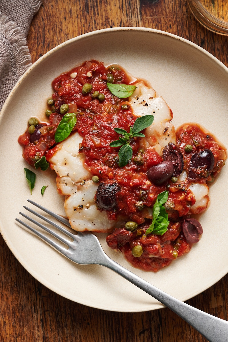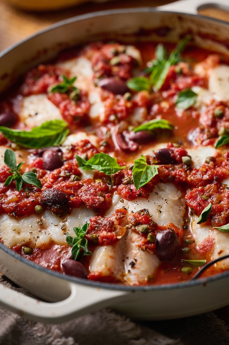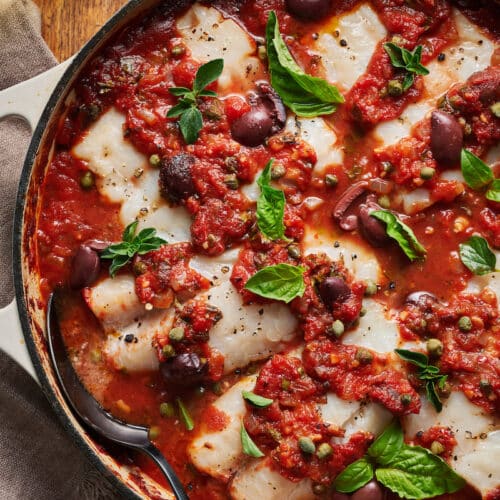If you love cod fish and puttanesca sauce, this is sure to become one of your favorite seafood recipes! Cod fillets are notoriously bland, so this hearty sauce loaded with red pepper flakes, olives, capers, garlic, and anchovies is the perfect paring. Serve with crusty bread and wine!