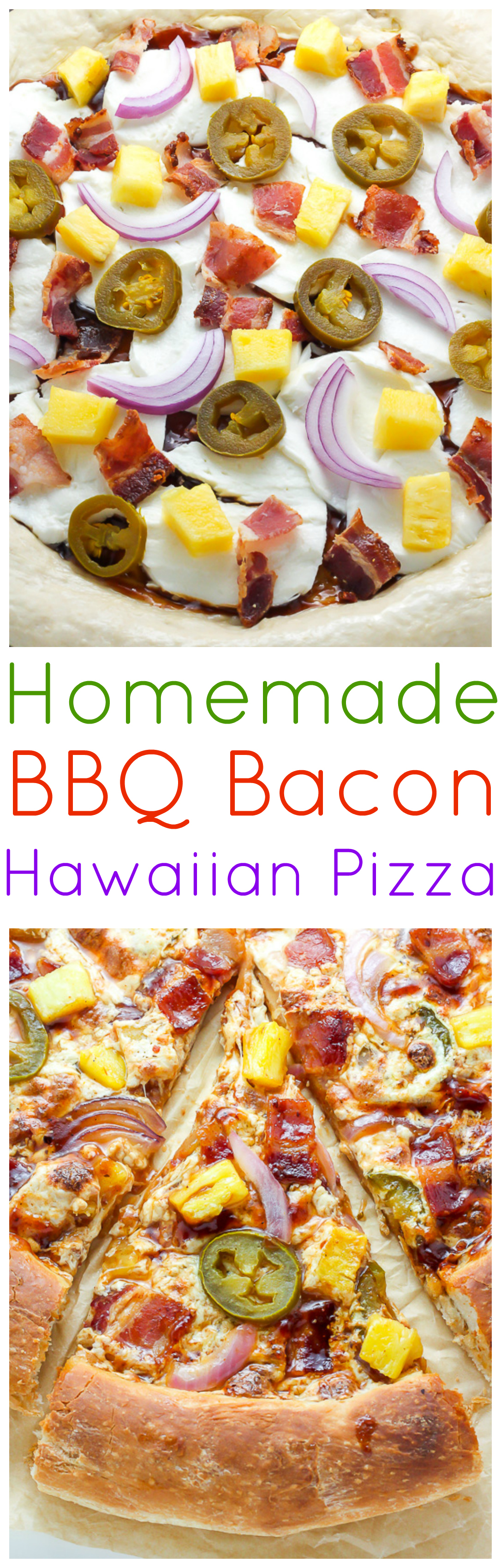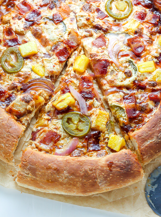 My ultra chewy pizza crust is topped with BBQ sauce, Bacon, Pineapple, and Jalapenos – this is a new favorite!