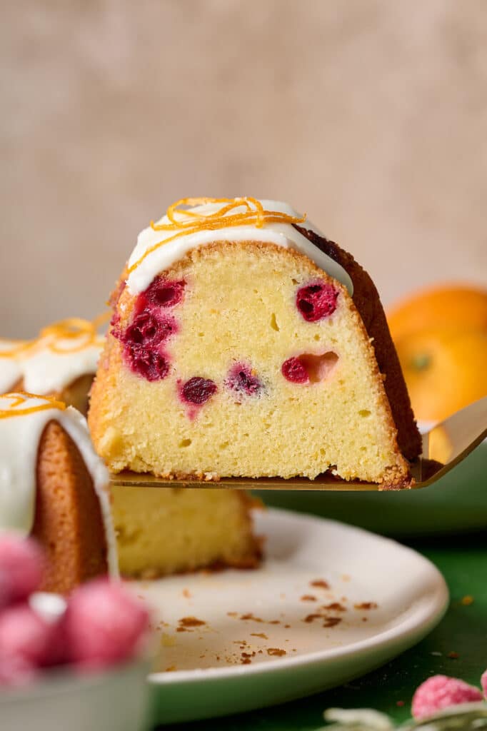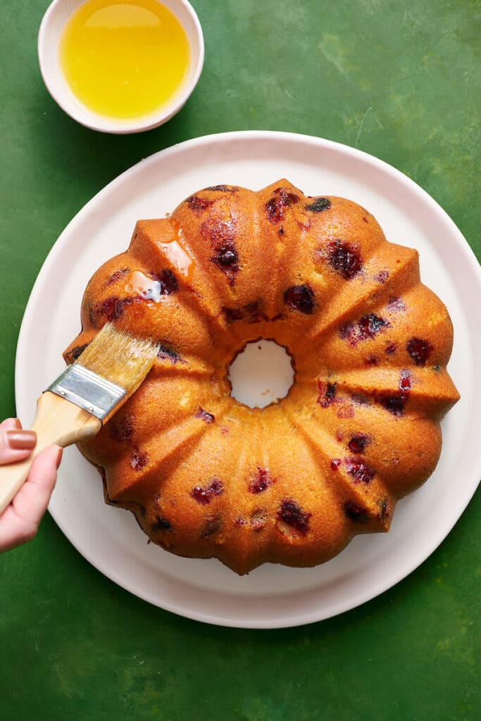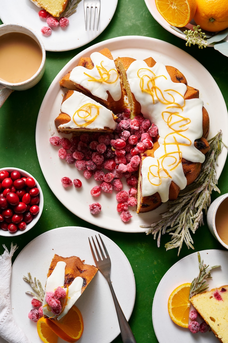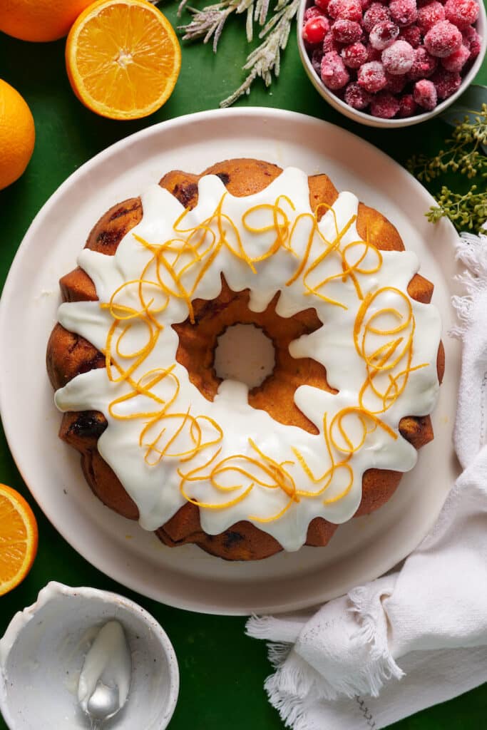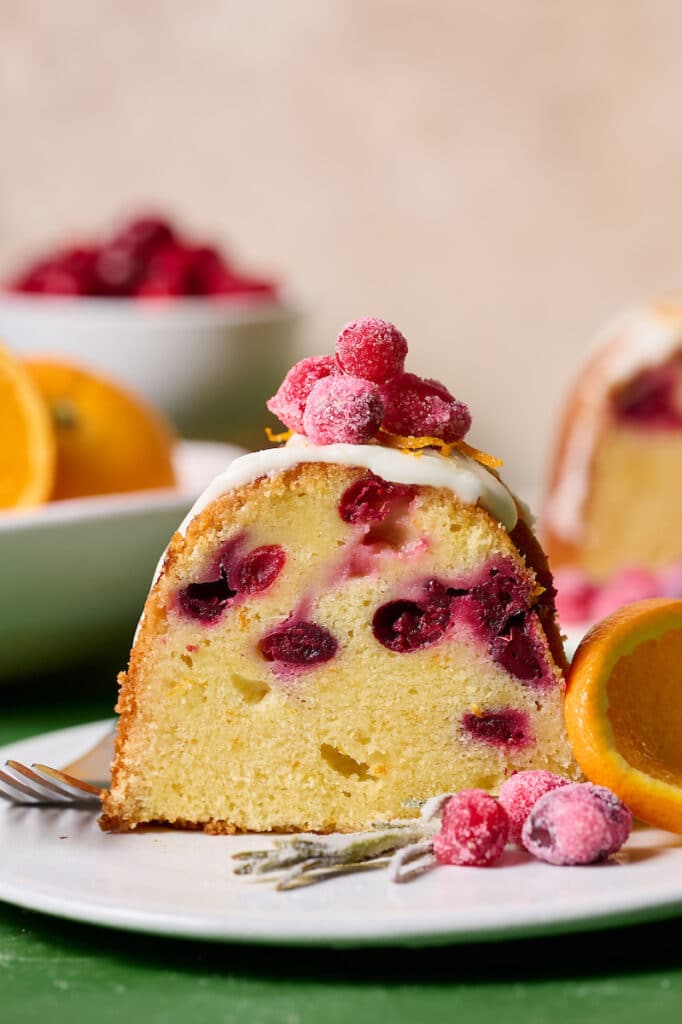 If you’re anything like me, half the fun of baking a cake is making it look stunning! I mean… who doesn’t love a showstopper? For this cake, I chose to top it with about 1 and 1/2 cups of sugared cranberries and orange peel. But the world is your oyster here! Feel free to leave it plain, top it with orange zest, candied ginger, or absolutely nothing at all.