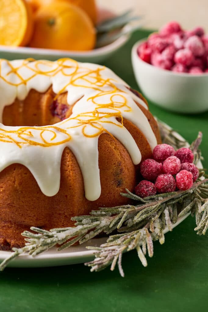 The Best Cranberry Orange Bundt Cake is ultra moist, packed with cranberries, and topped with a stunning orange glaze! Sugared cranberries and orange zest on top make it a showstopper. Perfect for Thanksgiving or Christmas dessert!