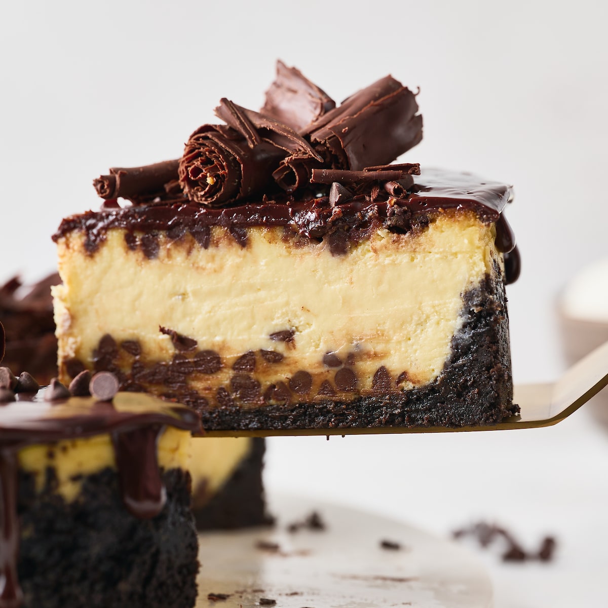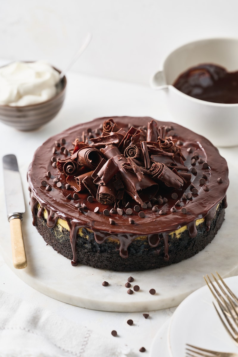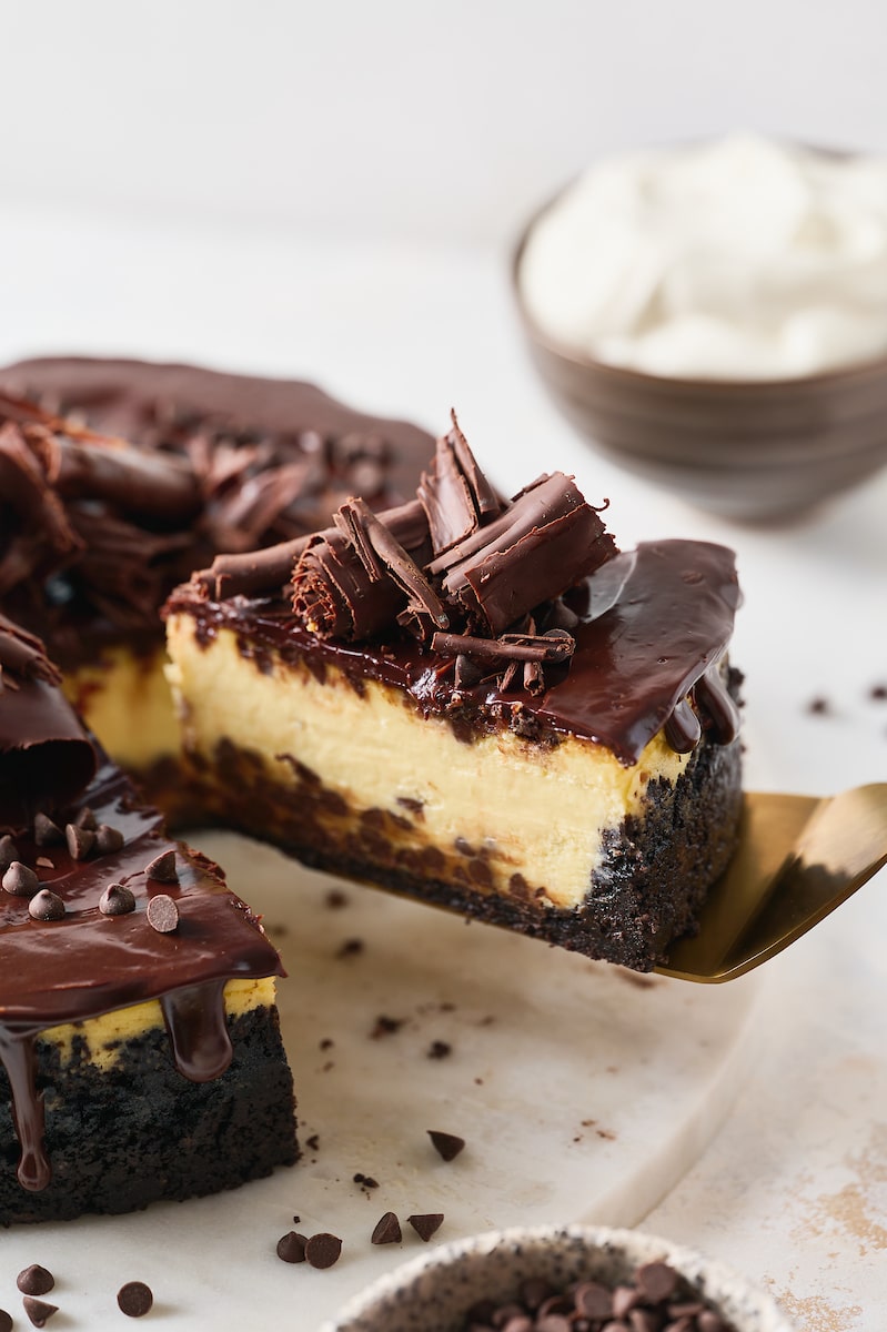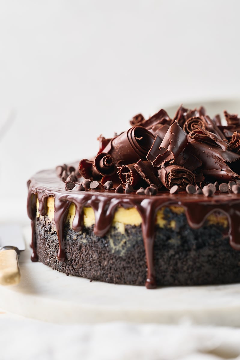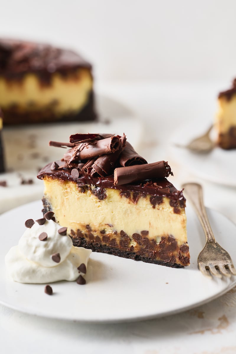 If you love chocolate and cheesecake, you’re going to fall hard for this black-bottom chocolate chip cheesecake! Featuring an oreo cookie crust and an ultra rich cheesecake filling spiked with mini chocolate chips. Plus, chocolate ganache and chocolate curls!
