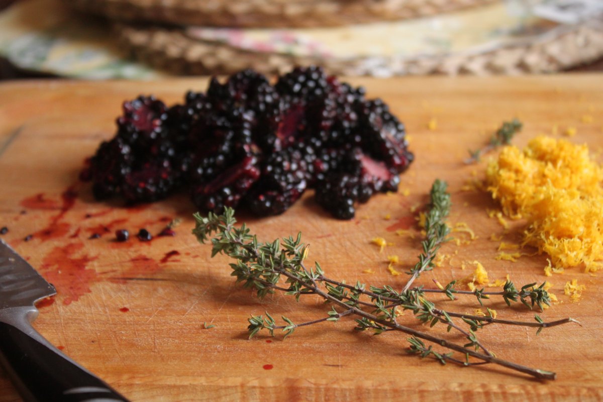 - 1 1/2 cups fresh (or frozen, thawed, drained) blackberries (about 6 ounces), halved lengthwise