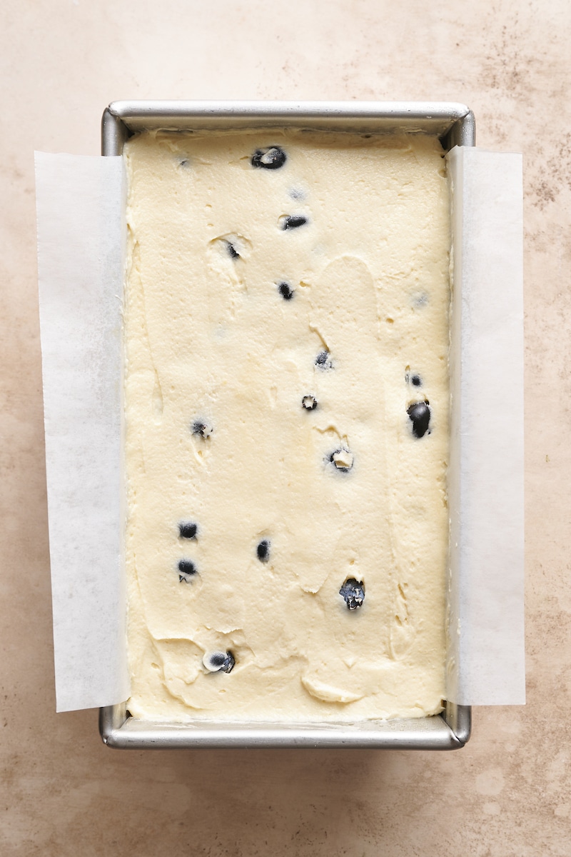 - Scrape ¾ of the batter into the prepared pan. Sprinkle the remaining blueberries on top, then scrape the remaining batter on top of the blueberries. Smooth the top with a rubber spatula.