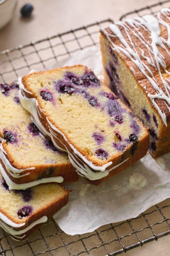 This Blueberry Pound Cake recipe is moist, buttery, and bursting with blueberries in every bite. Topped with sweet vanilla glaze, this classic snack cake is sure to become an instant favorite with you and your family.