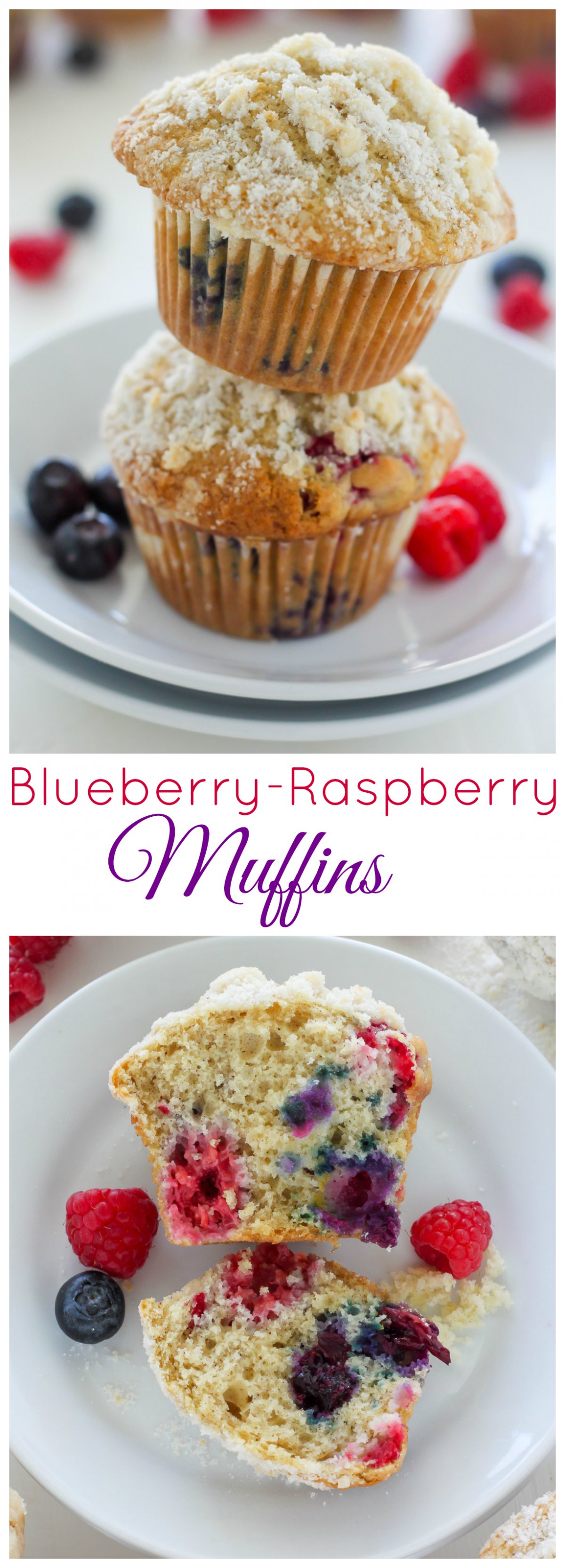 An easy recipe for Blueberry-Raspberry Muffins with Streusel Topping! Perfect for breakfast or as an afternoon snack! These blueberry raspberry muffins are the perfect Summer recipe!