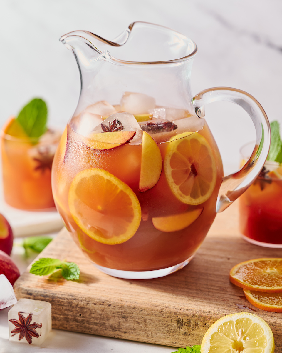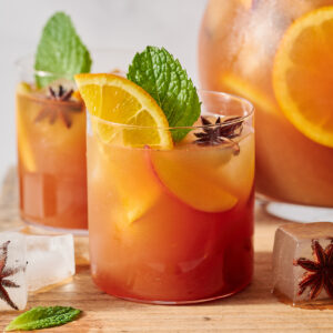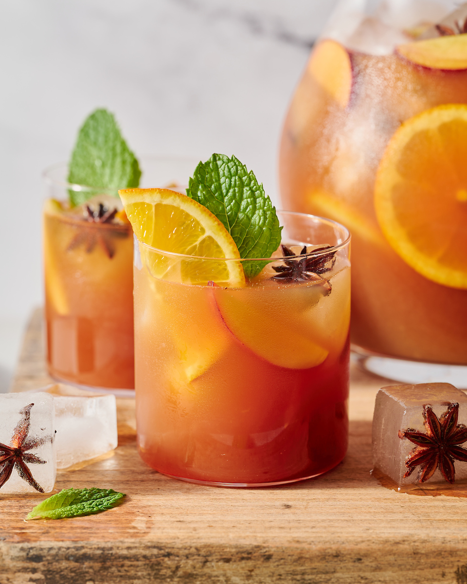 If you know me, you know I love to garnish my heart out. And for this recipe, our main garnish is the stunning star anise ice cubes. But in addition, I love to add fresh lemon slices, orange slices, peach slices, and mint sprigs! Obviously all of these are options – including the star anise ice cubes – but definitely take this recipe from plain Jane to stunning Sally lol!
