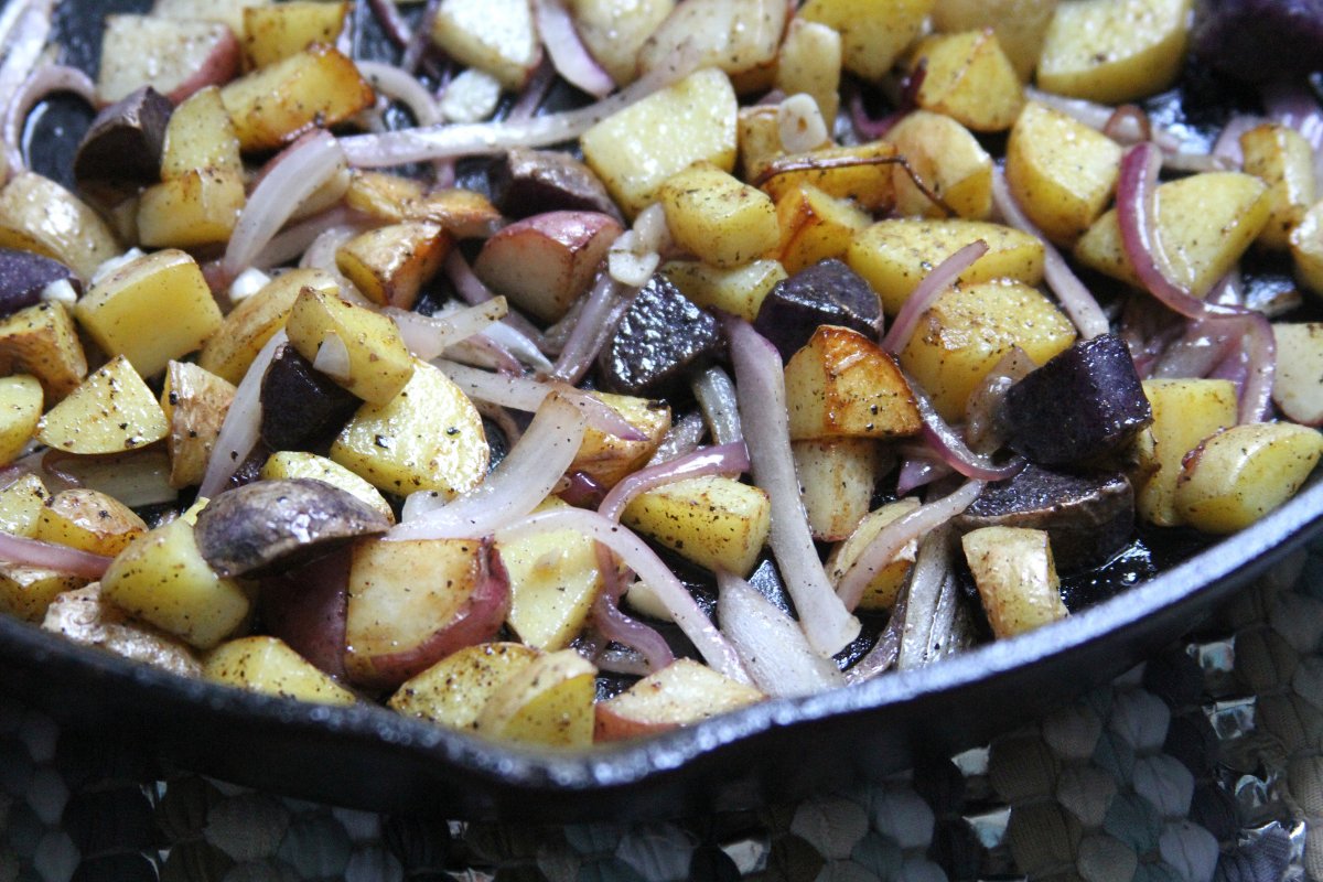 Because the home fries and bacon take the longest, you should get crackin’ on those first.