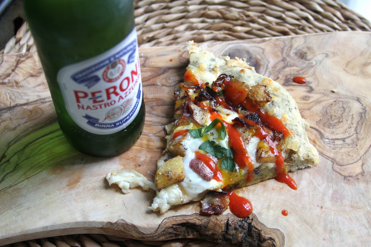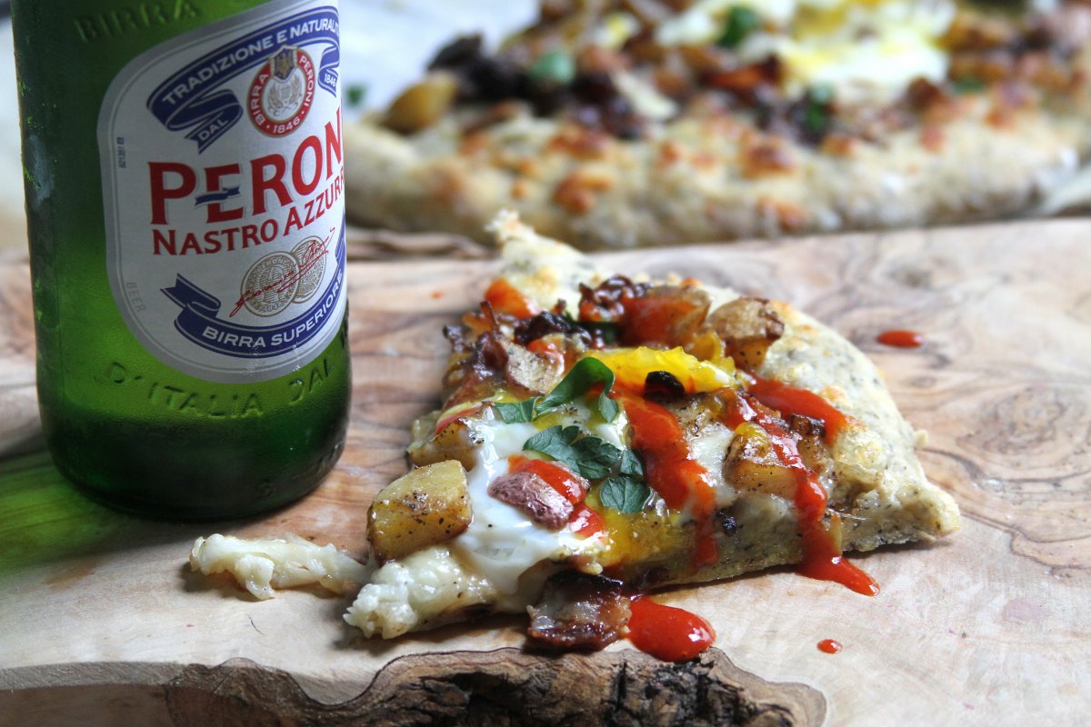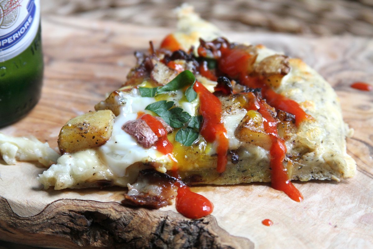 Last week I ran out of red sauce (tsk tsk), so I took an adventurous road to pizza land by making a sauce free pie, pimped out with home fries, bacon, and sunny side up eggs.