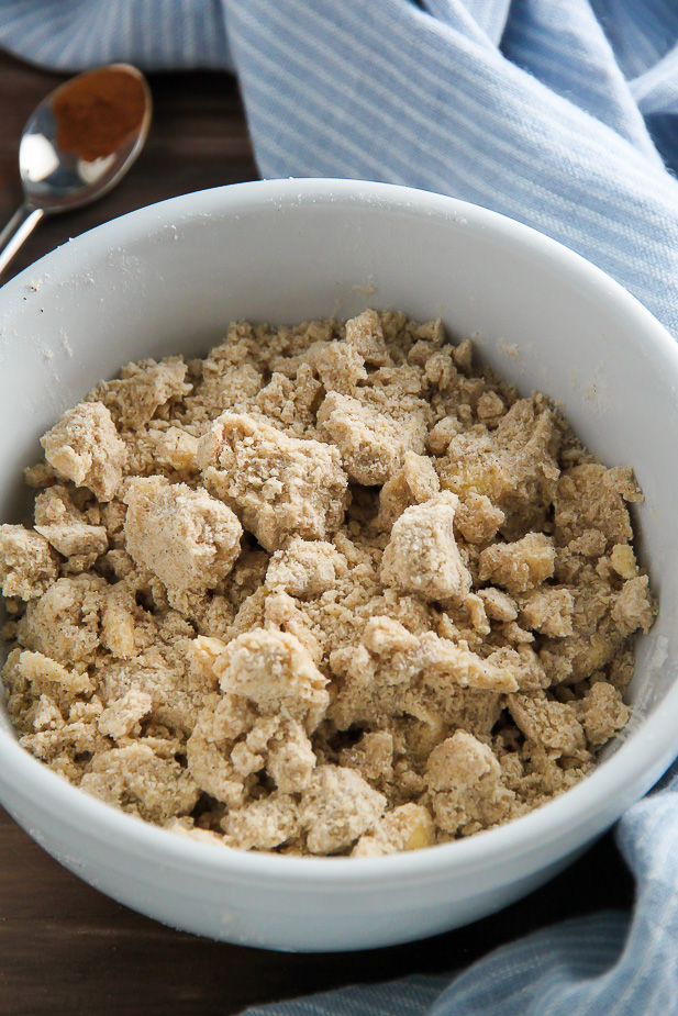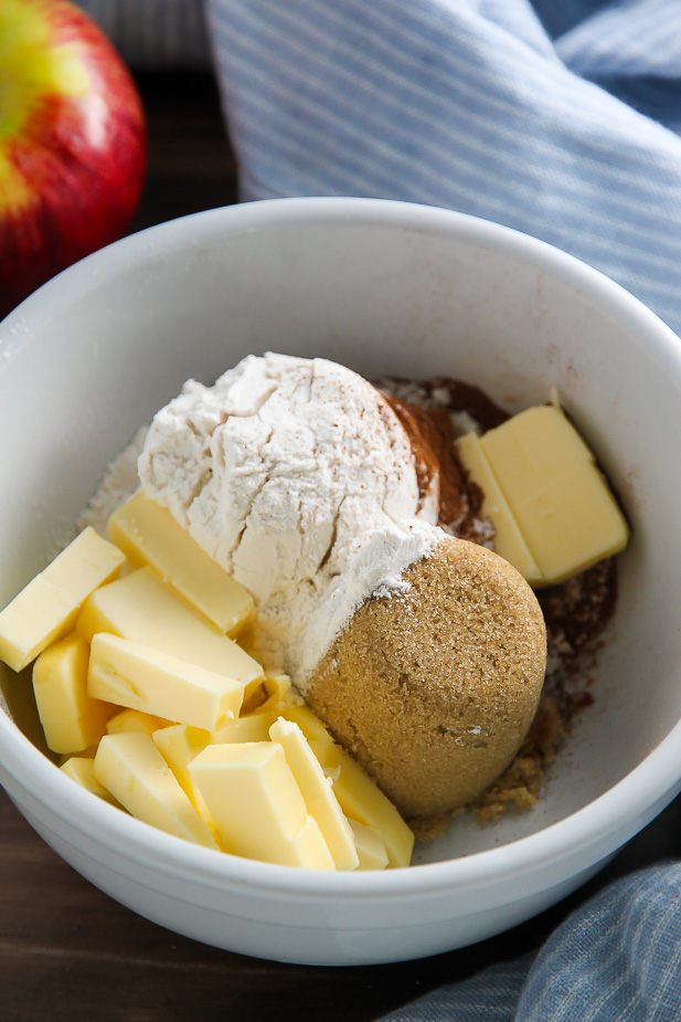 - In medium-sized bowl combine brown sugar, flour, cinnamon, and salt; mix until well combined. Quickly work in the butter using a pastry cutter, fork, or your fingers until well combined; stop when the butter reaches the size of tiny peas. Place in freezer until needed.