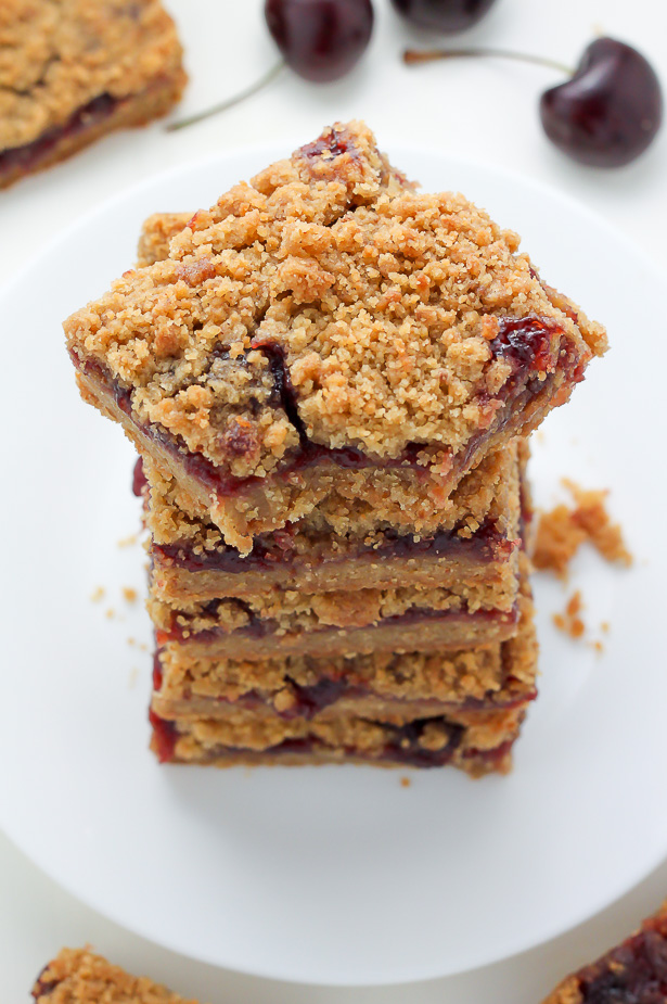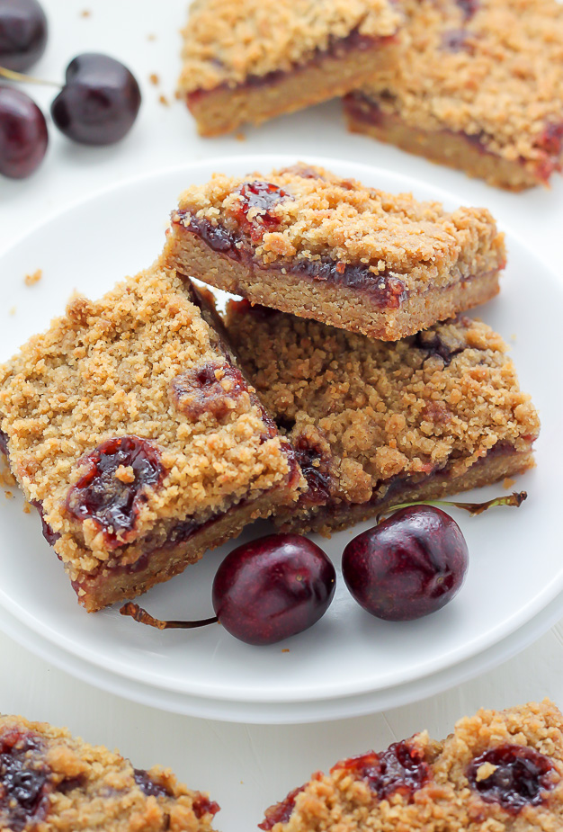 My sister stopped by our local market on her way to my house and swiped up these gorgeous cherry preserves along with a bottle of champagne and a few pastries. We gobbled the pastries and champagne a little too quickly, but I had plans for those preserves! The minute she placed the jar on the counter I knew crumb bars were a must. I based the recipe off of these raspberry crumb bars, making just two simple changes.