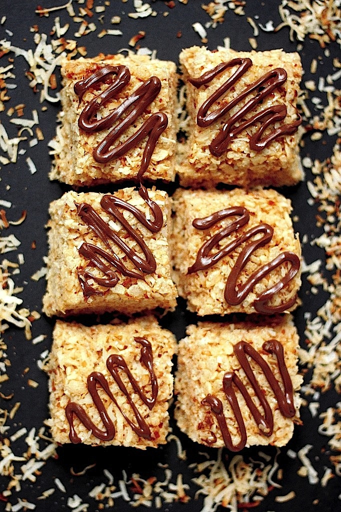 - Remove the pot from the stove and stir in the cereal and coconut. Quickly spread into prepared pan. Press it firmly and evenly into the edges and corners. Let cool then cut into squares. Drizzle each square with a little chocolate nutella. I put the nutella in a ziplock baggie, cut the edge off, then drizzled for a prettier presentation.
