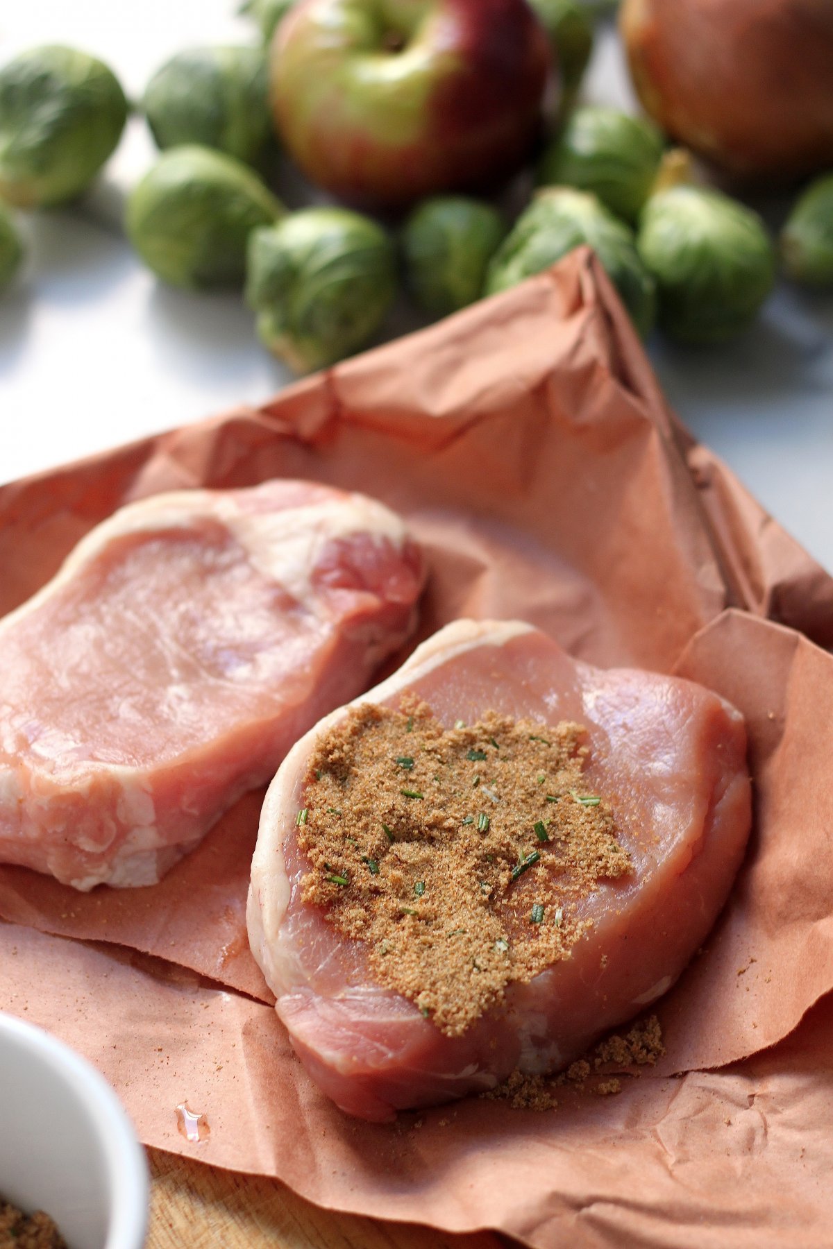It’s also just a plain delicious dinner option! The pork chops (which are amazingly affordable even if you’re buying the all natural/organic variety) are marinated in a brown sugar/ rosemary rub that also has little pops of cumin, cayenne, and paprika. This marinating process is only a 20 minute affair, and can be done while you’re shredding your veggies to prepare the caramelized brussels sprout, onion, and apple slaw. WIN.